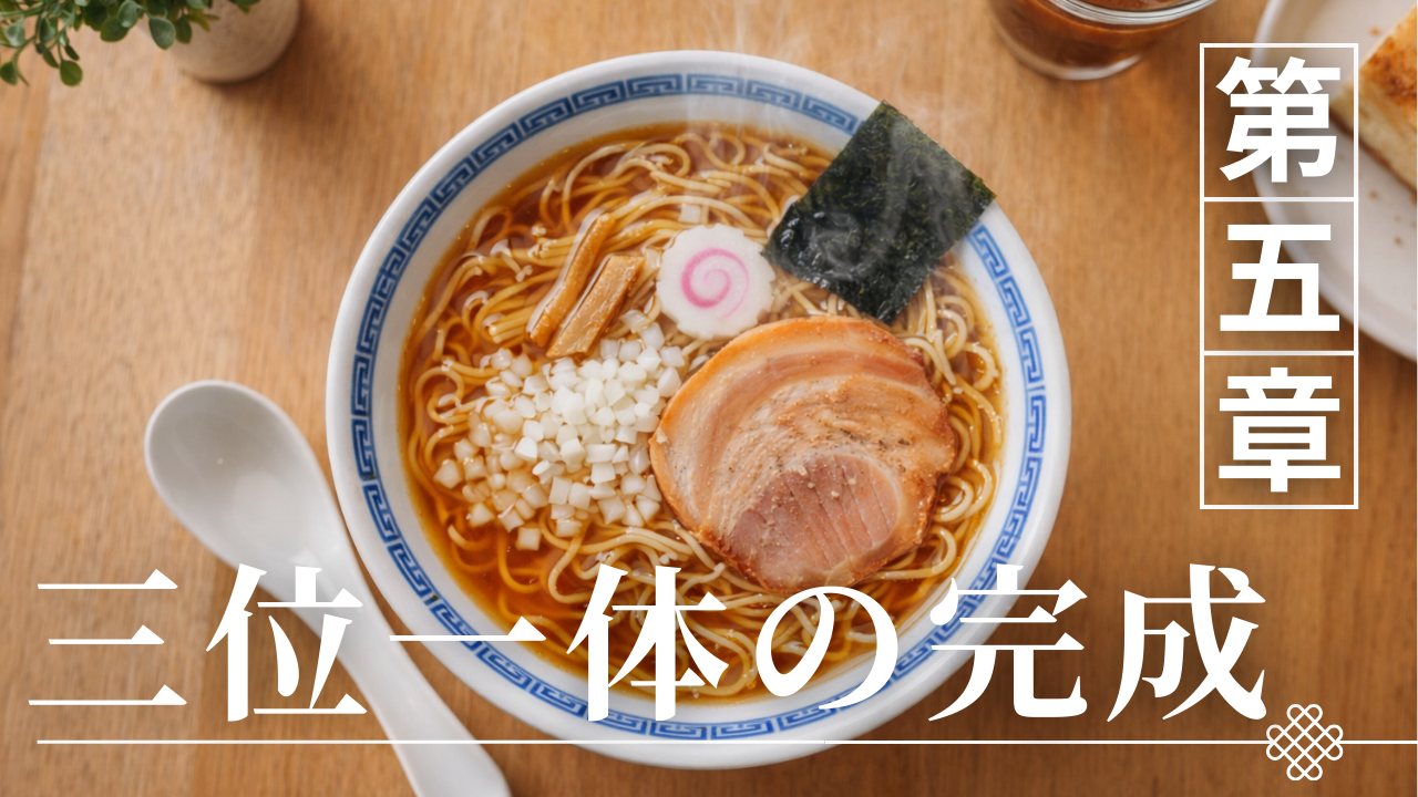 八王子ラーメンの特徴は、個々の要素の強さではなく、三要素がどのように組み合わされているかという「全体設計」によって成立している点にある。醤油清湯・ラード・刻み玉ねぎという構成は、それぞれ単体でも一定の役割を持つが、重要なのは相互作用によってバランスが最適化されていることである。このラーメンは、どれか一つの要素を強調することで成立するのではなく、三つの要素が互いに補完し合うことで成立する「三位一体型」の設計を持っている。この構造により、シンプルでありながらも単調にならず、日常的に食べ続けられる味が実現されている。本章では三要素の関係性を統合的に整理し、なぜこの組み合わせが成立し、長く支持されているのかを構造的に解き明かしていく。