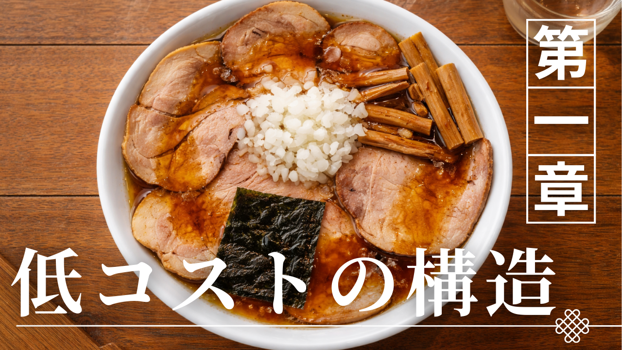 八王子ラーメンが開業モデルとして注目される理由は、単にシンプルなラーメンであるからではなく、「コスト構造」と「オペレーション構造」が合理的に設計されている点にある。醤油清湯・ラード・刻み玉ねぎという構成は、仕入れ・仕込み・提供のすべてにおいて無駄が少なく、結果として初期投資や運営コストを抑えながら安定した提供を可能にする。また構成要素が少ないことは作業の標準化にもつながり、人材依存度を下げる効果も持つ。このように八王子ラーメンは「シンプル=簡単」ではなく、「シンプル=合理的な構造」として成立している。本章ではその低コスト構造の内訳を分解し、なぜ開業に向いているのかを明確にする。