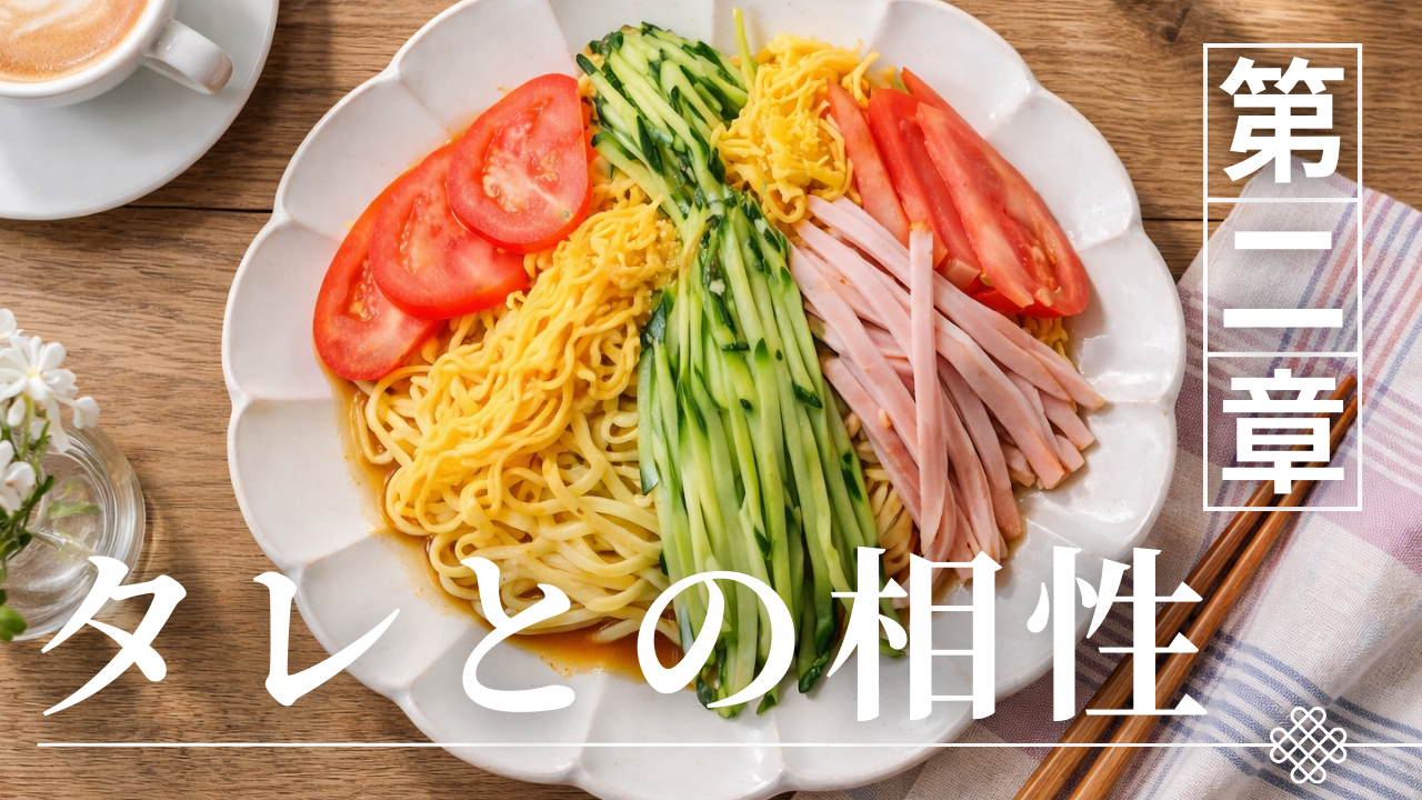 冷やし中華はタレを麺に絡めて食べる和え麺型の料理であるため、麺とタレの相性は料理の完成度を左右する重要な要素となる。ラーメンのようなスープ麺ではスープの量が多いため麺の表面構造の影響は比較的分散されるが、冷やし中華では少量のタレが麺全体に絡む構造になっている。そのため麺の表面の滑らかさや弾力、太さなどが味の広がりに直接関係する。特に中細麺と水締めによって整えられた麺は、タレを均一に絡めながらも重くなりすぎないバランスを持つ。また、麺と具材を一緒に食べたときに味が調和することも重要である。このように冷やし中華では、麺の表面構造とタレの性質を合わせることで料理全体のバランスが作られている。本章では麺とタレの関係を整理しながら、冷やし中華における相性設計を分析していく。
