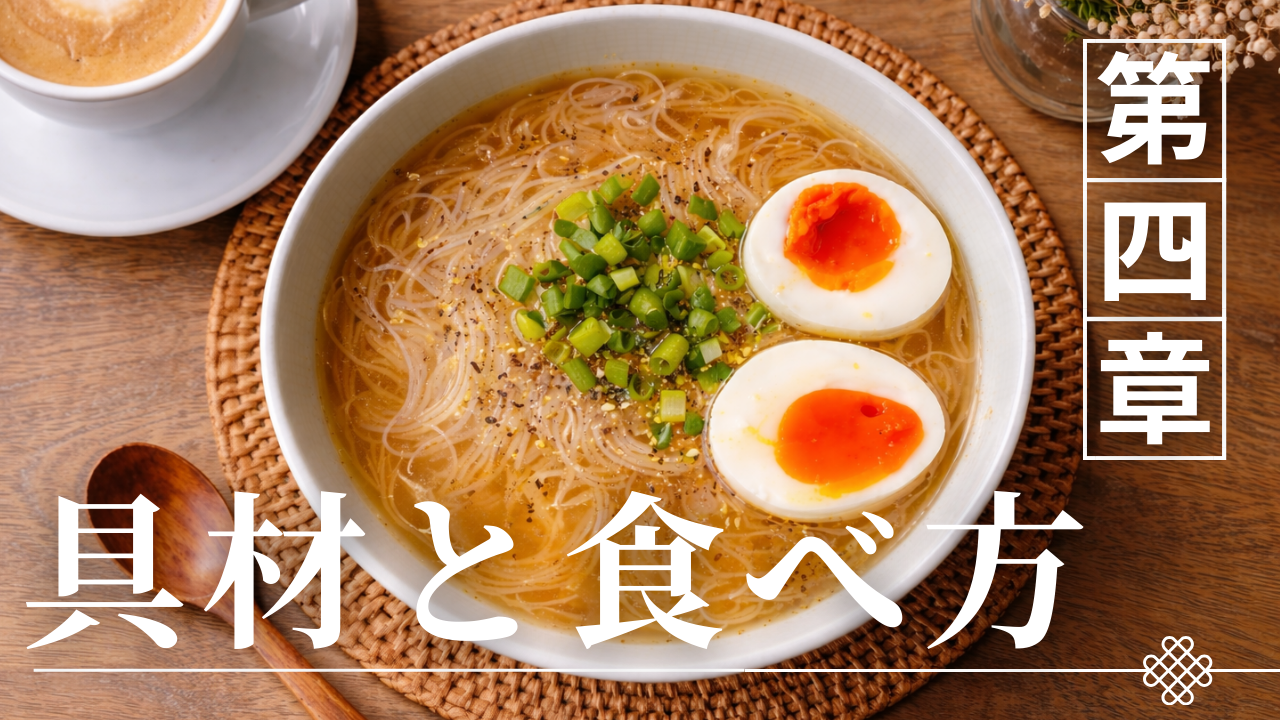 冷やしラーメンと冷やし中華の違いは、スープや麺だけでなく具材の使い方や食べ方にも表れている。麺料理では具材が料理の見た目や味に影響するだけでなく、食べ方そのものにも関わることがある。冷やしラーメンでは麺とスープを中心とした構造の中で具材が補助的な役割を持つのに対し、冷やし中華では具材が料理の印象を大きく左右する要素になる。この違いは盛り付け方や食べる手順にも影響するため、両者を比較すると料理構造の違いがよりはっきりと見えてくる。本章では、具材の配置や食べ方の違いを整理しながら、冷やしラーメンと冷やし中華の料理構造の違いを解説していく。