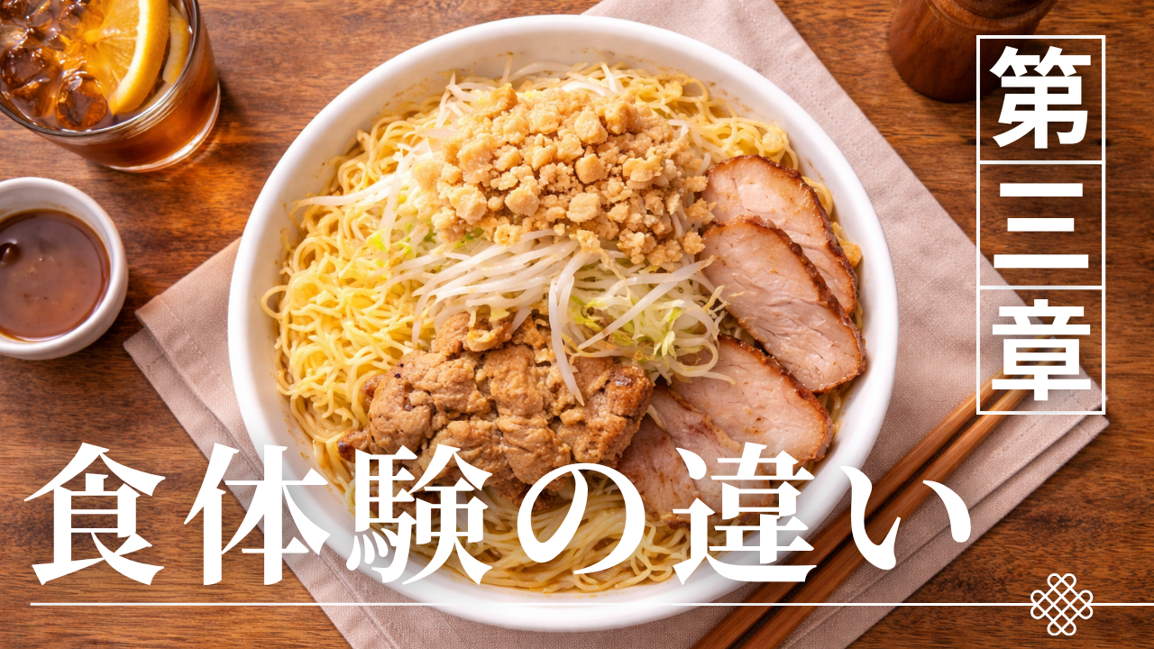 二郎ラーメンと家系ラーメンの違いは味だけでなく、「どのように食べるか」という体験構造にも大きく現れる。両者は同じラーメンでありながら、満腹感の作り方、咀嚼の必要性、食事のリズムが異なり、それぞれ異なる食事体験を生み出している。この違いは偶然ではなく、麺・スープ・量の設計が連動することで意図的に形成されているものである。本章では、食体験を構成する要素を分解し、両者の違いを整理する。