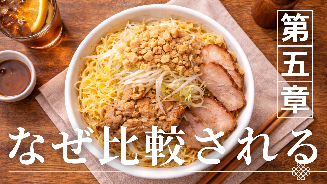 二郎ラーメンと家系ラーメンは構造的に大きく異なるにもかかわらず、しばしば比較対象として語られる。この背景には、単なる人気や知名度だけではなく、「同じ文脈に乗りやすい共通点」と「明確に分岐する構造」の両方が存在していることがある。つまり、両者は似ているから比較されるのではなく、「似ている部分と違う部分が共存している」ために比較が成立する。本章では、その共通点と分岐点を整理し、なぜ両者が対比され続けるのかを構造的に明らかにする。