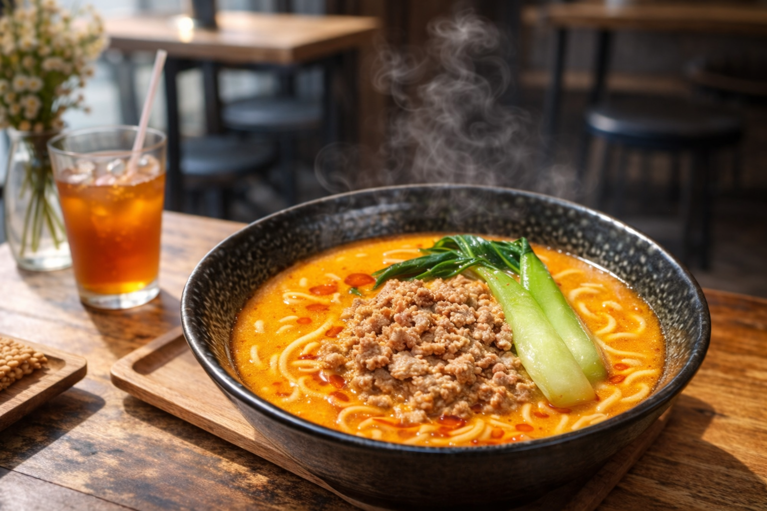 担々麺は中国四川省発祥の麺料理で、胡麻のコクと香辛料の辛味を特徴とするスープ麺である。日本では鶏ガラや豚骨のスープに芝麻醤(チーマージャン)を加えた濃厚なスープが一般的で、そこにラー油や唐辛子の辛味、花椒のしびれが加わることで独特の味わいが生まれる。具材には豚ひき肉を使った肉味噌や青菜、ねぎなどが使われることが多く、スープと麺、具材が一体となった味を楽しめる料理である。辛つけ麺が麺をつけ汁に浸して食べるスタイルであるのに対し、担々麺はスープと麺を一緒に味わう麺料理である。また、胡麻のコクが強い点も担々麺の大きな特徴であり、辛味だけでなく濃厚でまろやかな風味を楽しめる麺料理として人気がある。