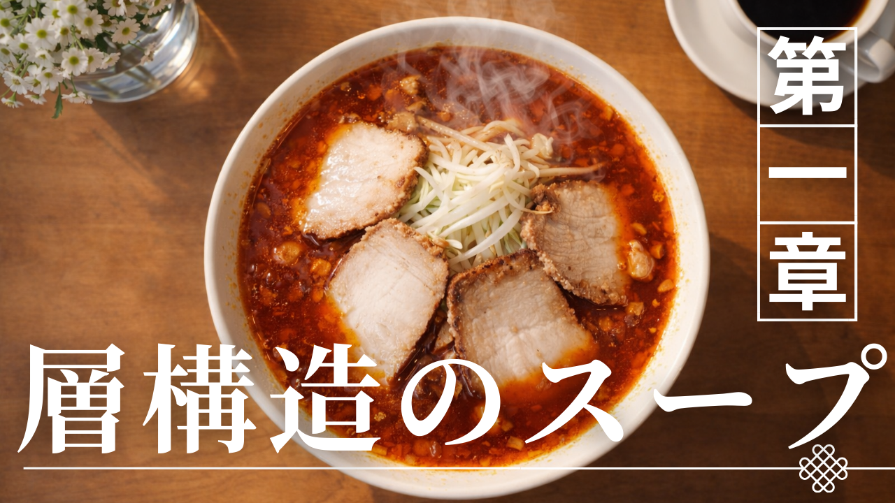勝浦タンタンメンのスープを理解するためには、まずこのラーメンがどのような構造を持つスープなのかを整理する必要がある。見た目はラー油で真っ赤に染まった激辛スープであるため、辛さが中心の料理として認識されることが多い。しかし実際の味の骨格は、日本のラーメン文化で最も基本的な醤油スープにある。つまり勝浦タンタンメンは、醤油ラーメンを基盤にしながら、ラー油による辛味、挽き肉の旨味、玉ねぎの甘味、そして油のコクを重ねることで成立しているスープである。このような構造によって、単に辛いだけではない複雑な味の層が形成されている。本章では、まず勝浦タンタンメンのスープの基本構造を整理し、どのような要素が組み合わさってこの独特の味が作られているのかを分解していく。