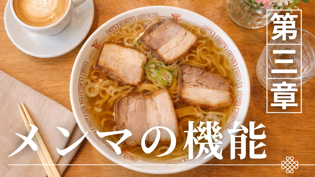 このような作用によって、メンマはラーメンの食べ進め方に変化を与える具材として機能する。つまりメンマは、ラーメンの食感のバランスを整える役割を持つのである。