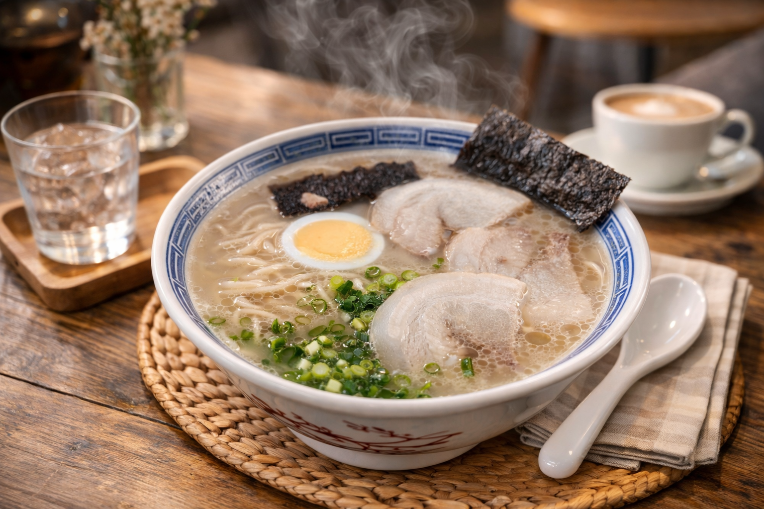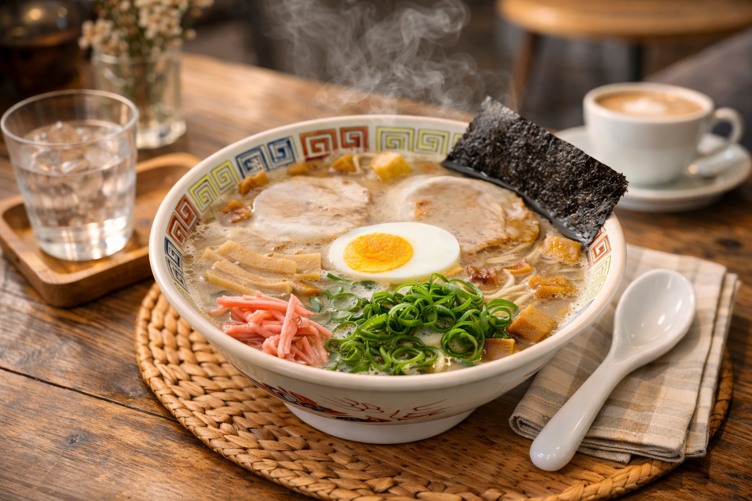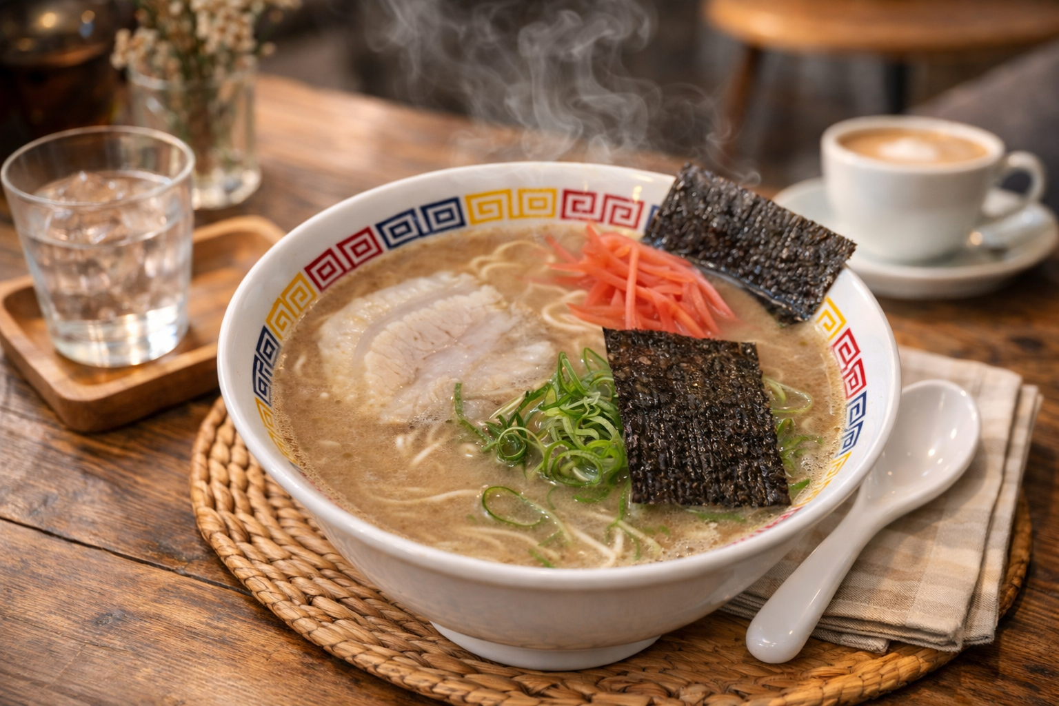 久留米ラーメンは濃厚な呼び戻しスープが主役ですが、トッピングはその強烈な味を支え、調整する重要な役割を担っています。代表的なのはチャーシュー、青ネギ、そして紅生姜。いずれもシンプルながら、濃厚豚骨との相性を計算された構成です。