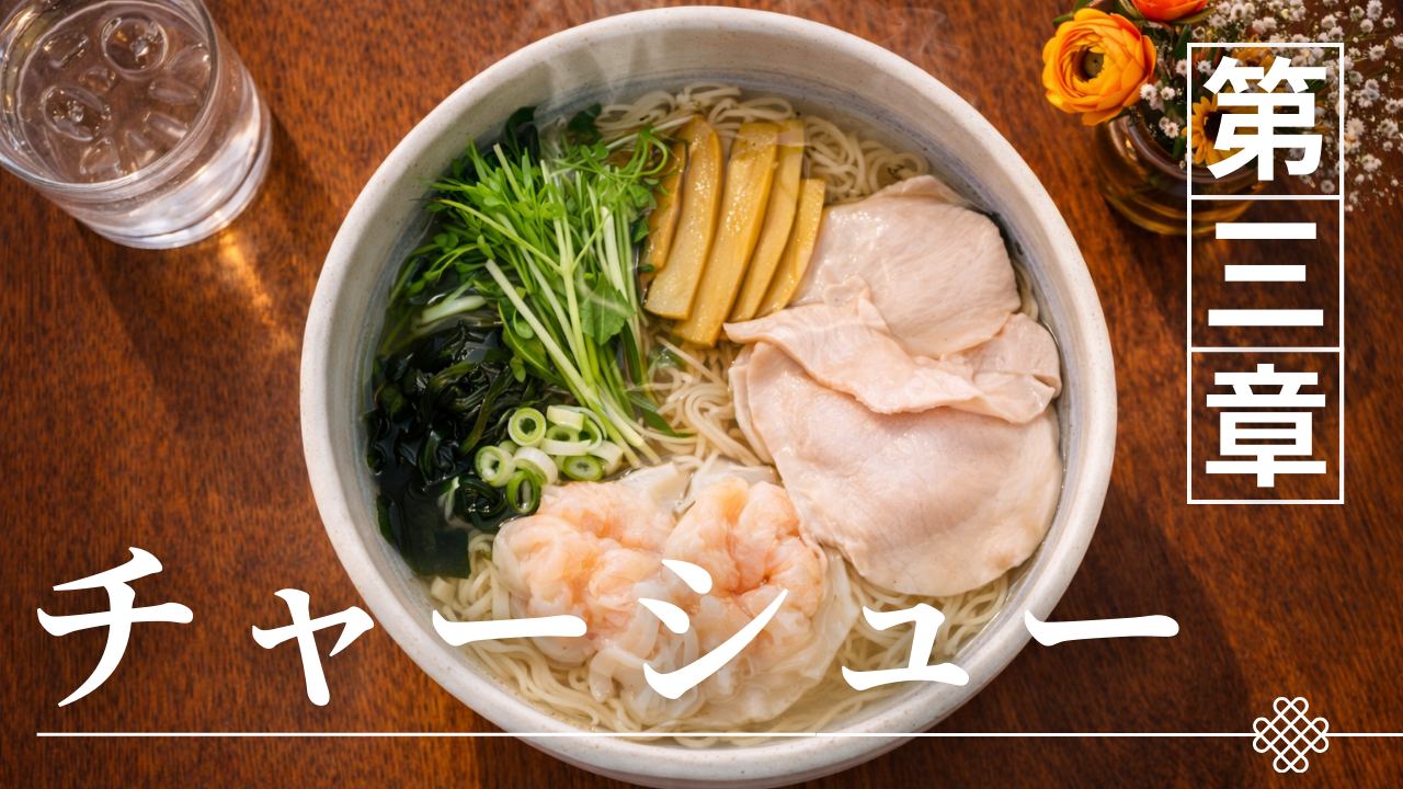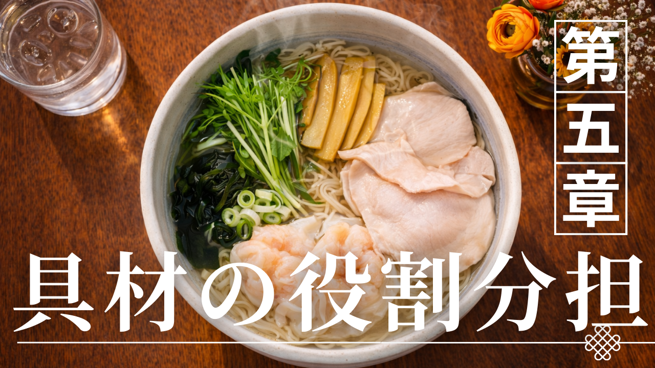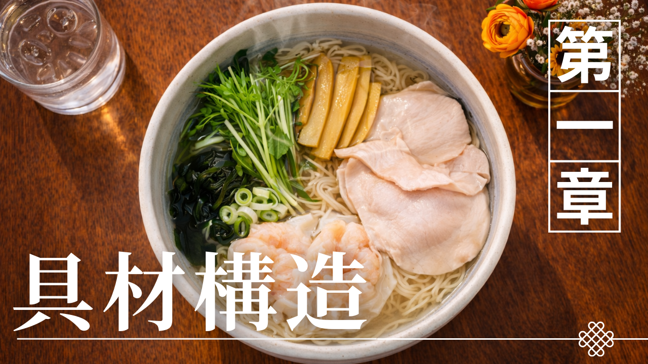 酒田ラーメンの魅力は煮干し醤油スープや自家製中細麺といった要素だけで成立しているわけではない。実際の一杯の構造を見ると、スープ・麺・具材という三つの要素が互いに補完し合うことで料理としての完成度が生まれている。特に具材は、単に見た目やボリュームを加える存在ではなく、味・食感・香りといった異なる要素を補う役割を持っている。酒田ラーメンではワンタン、チャーシュー、ネギといった具材がよく使われるが、それぞれが異なる機能を持ち、スープや麺と組み合わさることで一杯のラーメンのバランスを整えているのである。例えばワンタンは滑らかな食感を加え、チャーシューは肉の旨味とボリュームを補い、ネギは香りや清涼感を加える役割を持つ。このように具材は料理構造の中で明確な役割を担っている。本章では、酒田ラーメンの具材がどのような構造の中で機能しているのかを整理し、具材の基本的な役割を確認していく。