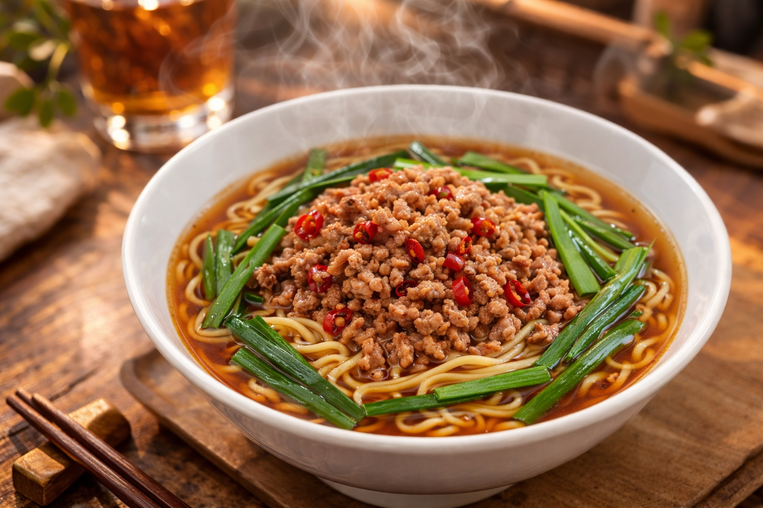 台湾まぜそばのトッピングと具材は、濃厚なタレと極太麺の味を引き立てる重要な要素であり、香り・食感・旨味のバランスを作る役割を持つ。中心となる具材は「台湾ミンチ」と呼ばれる辛いひき肉である。台湾ミンチは豚ひき肉をにんにく、唐辛子、醤油などで味付けして炒めたもので、台湾まぜそばの味の核となる存在である。この台湾ミンチが麺と混ざることで、強い旨味と辛味が料理全体に広がる。
