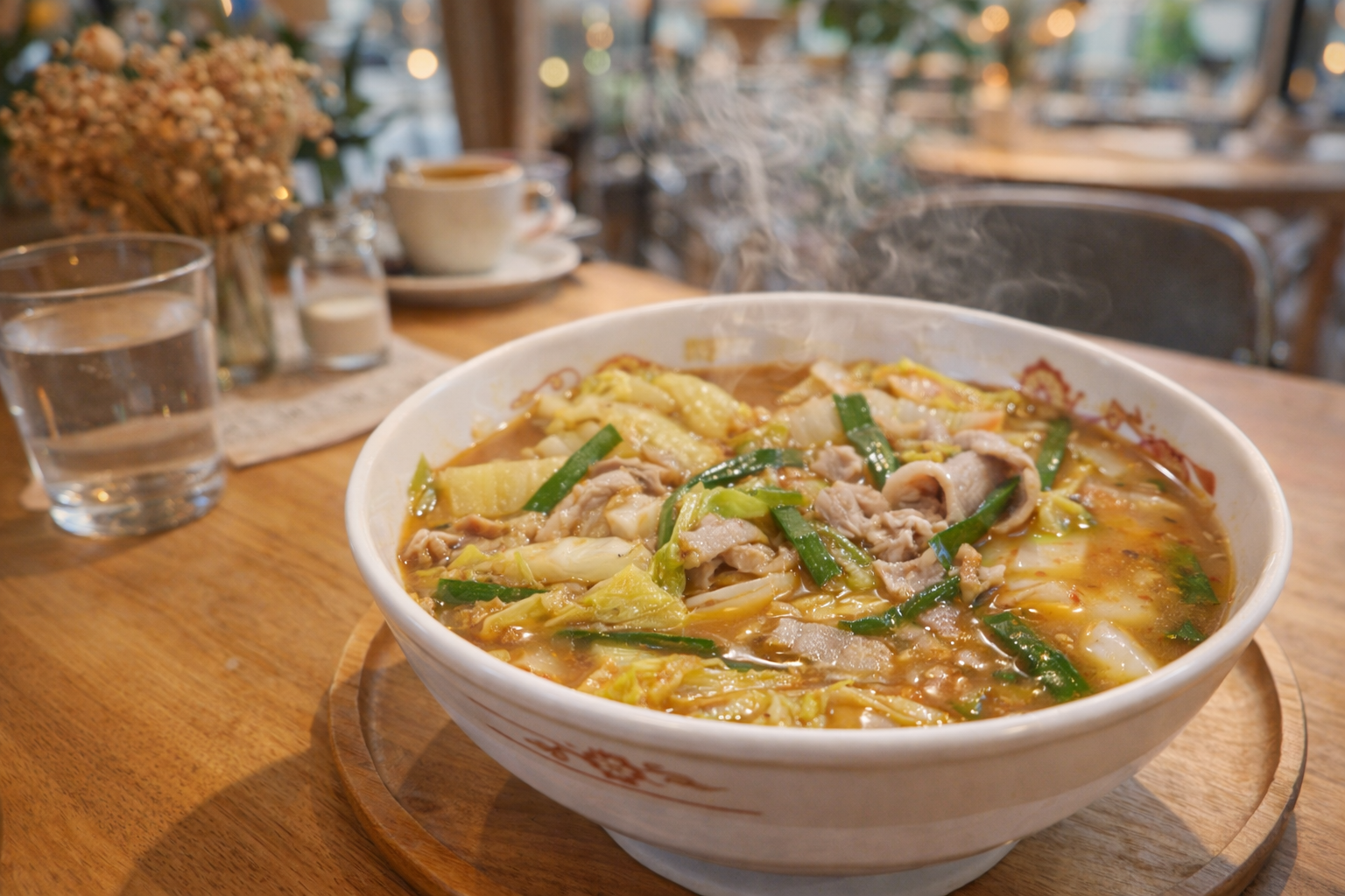 スープは醤油ベースにニンニクと唐辛子を効かせたピリ辛仕様。辛さは強烈というよりも“じわっと効く”タイプで、白菜の甘みと豚肉の旨味が辛味を包み込みます。油分は過度に重くなく、野菜から出る水分が全体をまとめる役割を果たします。