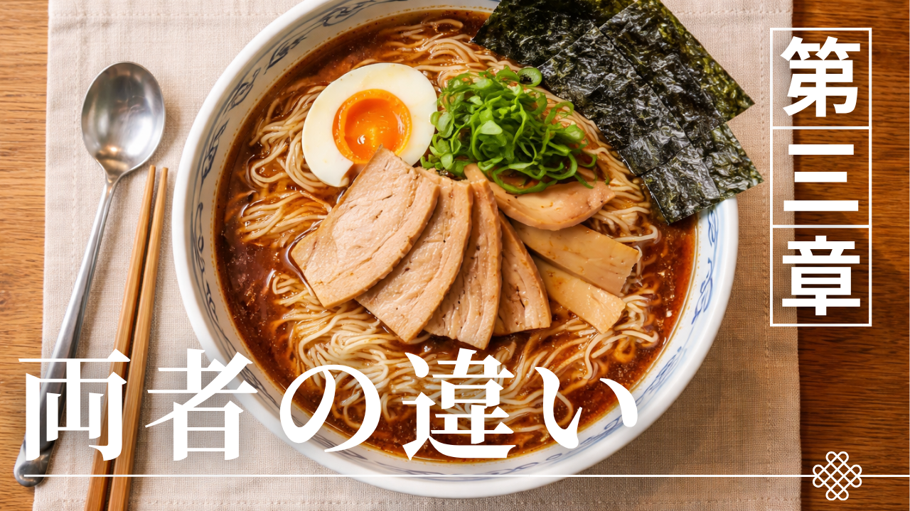 このように、両者は似ているようでありながら、根本的には異なる方向性を持つラーメンである。東京生姜醤油ラーメンと長岡系の違いは、単なる味の差ではなく、スープ・生姜・油・設計思想といった複数の要素が組み合わさった構造の違いにある。この視点で捉えることで、両者の関係性がより明確に理解できる。