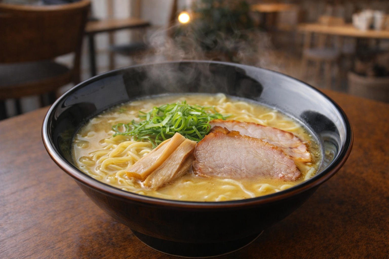 豚骨ラーメンは、豚骨を長時間強火で煮込んで作る白濁スープを特徴とするラーメンである。骨を煮込むことでゼラチンや脂が溶け出し、濃厚でコクの強いスープになる。特に九州の博多ラーメンが代表的で、独特の香りと力強い旨味を持つスープが特徴である。鶏白湯ラーメンと同様に白濁スープだが、豚骨ラーメンは脂やゼラチンが多いため、より濃厚で重厚な味わいになる。味付けは醤油ダレや塩ダレが使われるが、スープ自体の旨味が強いため比較的シンプルな味付けが多い。麺は細麺が使われることが多く、替え玉文化があるのも特徴の一つである。トッピングにはチャーシュー、ネギ、きくらげ、紅しょうがなどが定番である。豚骨ラーメンは日本のラーメン文化を代表するジャンルの一つであり、地域ごとに多様なスタイルが存在する
