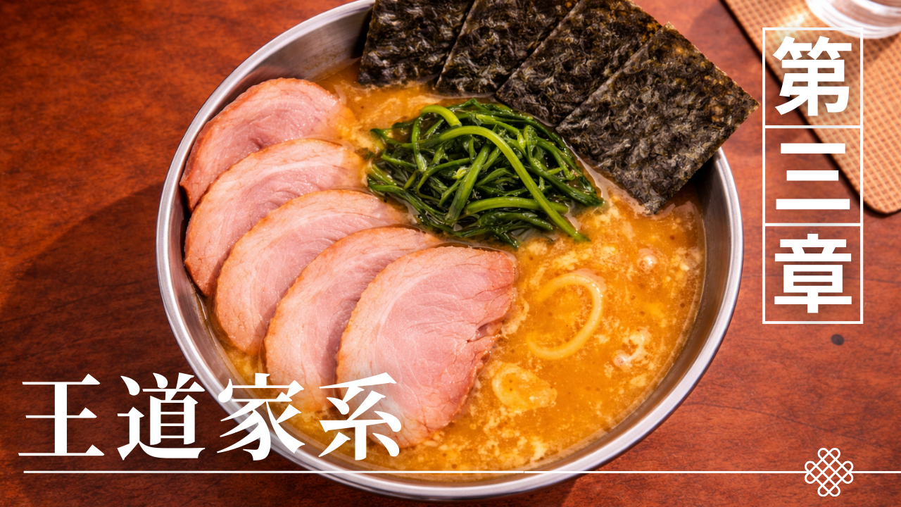横浜家系ラーメンの店舗は、すべてが直系の系譜に属しているわけではない。家系ラーメンの人気が広がるにつれて、直系以外の店舗でも家系ラーメンのスタイルを取り入れる店が増え、現在ではこうした店舗が「王道家系」と呼ばれることが多い。王道家系とは明確な制度的分類ではなく、一般的には直系の修行制度を経ていないものの、豚骨醤油スープ、太麺、海苔やほうれん草といった家系ラーメンの特徴を踏襲している店舗を指す言葉として使われている。こうした店は各地で独自に家系ラーメンのスタイルを発展させており、結果として家系ラーメンの多様性を広げる存在となっているのである。本章では王道家系ラーメンという分類に焦点を当て、その特徴や成り立ち、そして家系ラーメン文化の中でどのような位置づけを持つのかを整理していく。