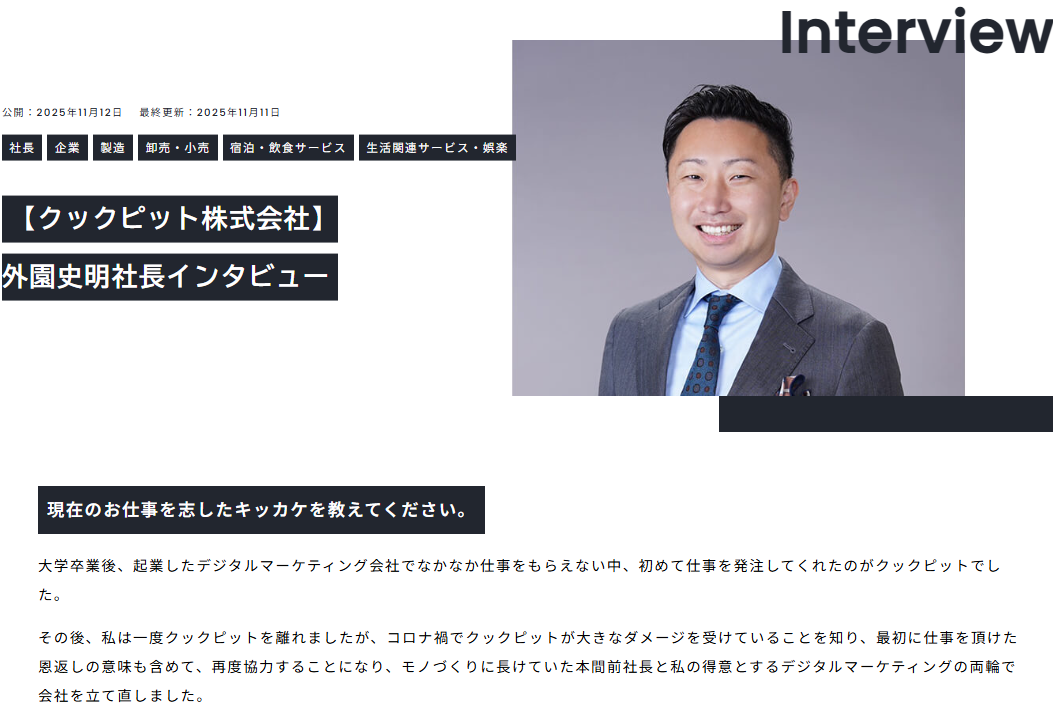 このたび、クックピット株式会社 代表取締役社長 外園 史明 による 就任後初のインタビュー記事 が、the Leader にて公開されました。