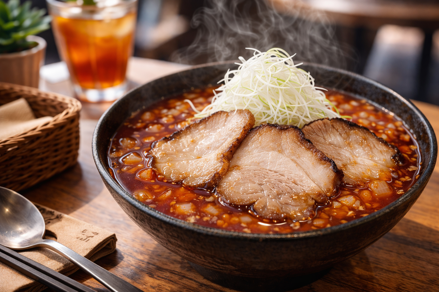 「勝浦たんたん麺 あざみ」は、勝浦タンタンメン専門店として高い人気を誇る名店です。表面を覆うラー油が生み出す強烈な辛さと高温スープが特徴で、寒い土地ならではのご当地ラーメンの魅力を存分に体感できます。玉ねぎの甘みと醤油の旨味が重なり、辛さの中にも深いコクを感じる一杯。勝浦タンタンメンを語るうえで外せない存在です。