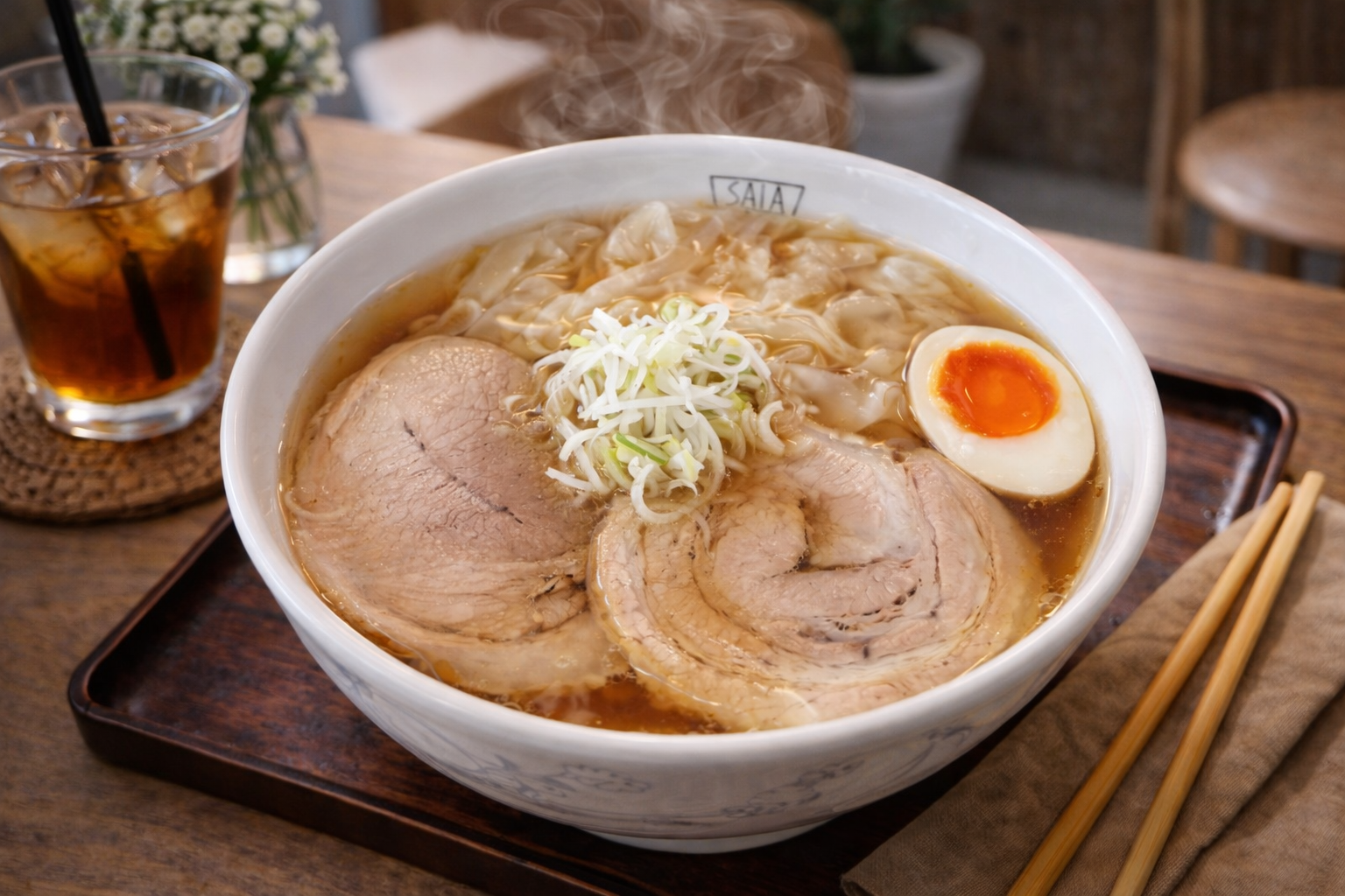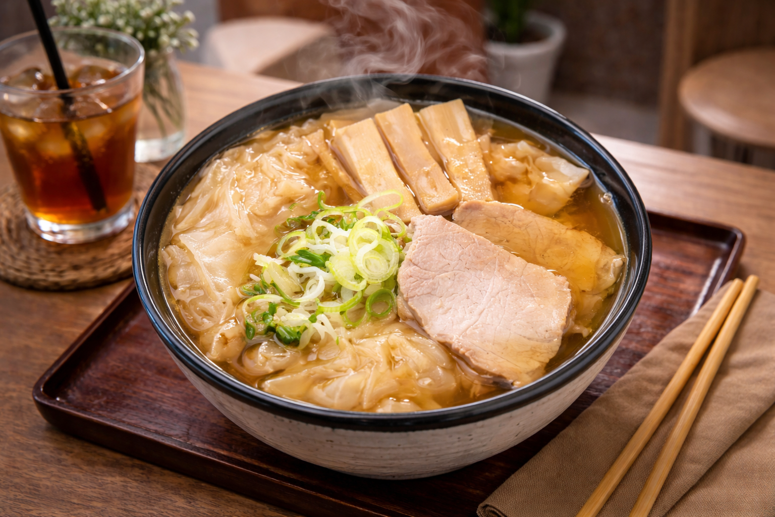 酒田ラーメンの象徴ともいえる名店「ワンタンメンの満月 酒田本店」は、地元で長年愛され続ける老舗です。看板のワンタンメンは、薄皮でつるりとした食感のワンタンがたっぷり入った贅沢な一杯。醤油ベースのスープは煮干し出汁の旨味が効いており、あっさりしながらも奥行きのある味わいです。麺は酒田らしい縮れ麺でスープとの相性も抜群。ワンタンの餡のジューシーさがスープに溶け込み、食べ進めるほどに美味しさが増していきます。観光客にも人気が高く、「酒田に来たなら一度は食べたい」と言われる名店です。