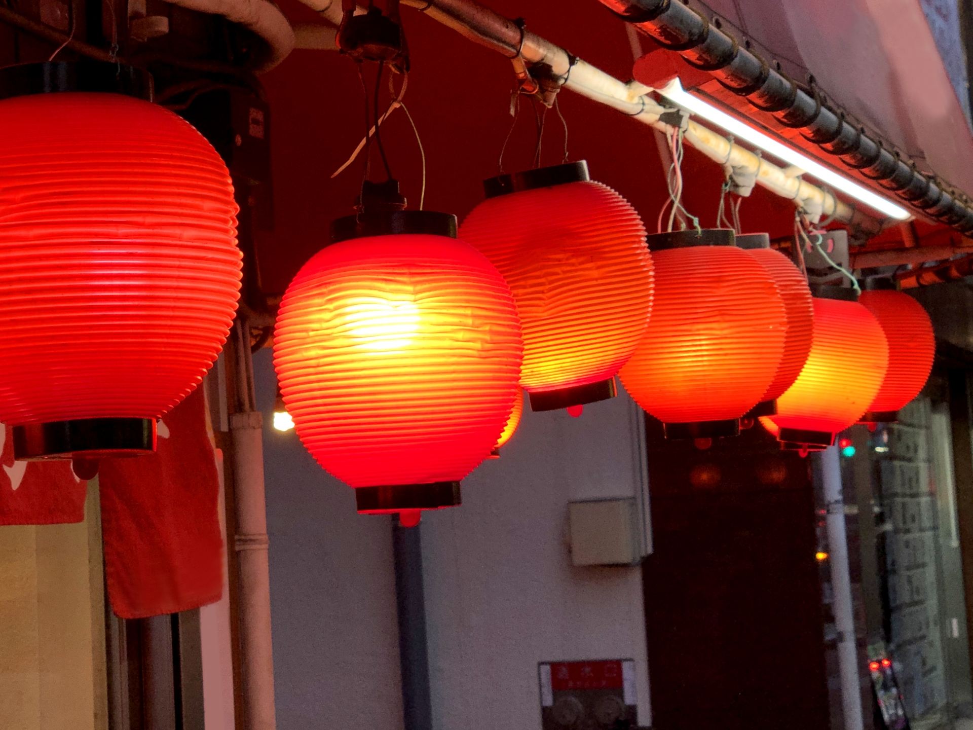 1. 赤ちょうちんと暖簾:親しみやすく目を引く昭和風の演出。