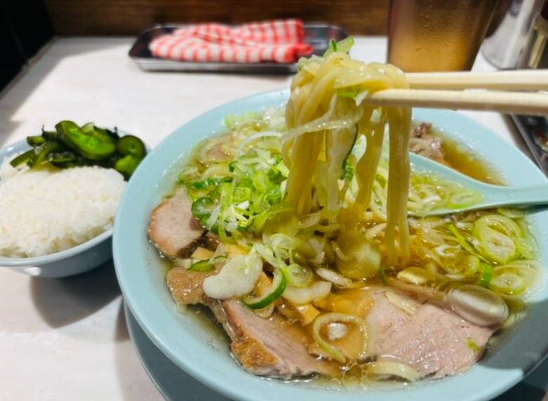 麺は、ちゃん系ラーメンらしく太めのストレート麺を使用。力強いコシともちもち感があり、ひと口すすれば小麦の風味がふわっと広がります。濃厚スープをしっかりと持ち上げるため、一口ごとの満足感が大きく、背脂の甘みや醤油のキレと合わさって完成度の高い味わいを生み出します。太麺ながら重さを感じにくく、スルスルと食べ進められるのも魅力。また、スープに長時間浸しても伸びにくく、最後まで弾力を保つ設計がされています。並盛でも十分なボリュームがありますが、大盛りを選べばさらに満腹感を得られる仕様。濃厚なスープや豪快な具材に負けない存在感を放つ麺は、ちえちゃんラーメンの一杯を支える重要な要素です。