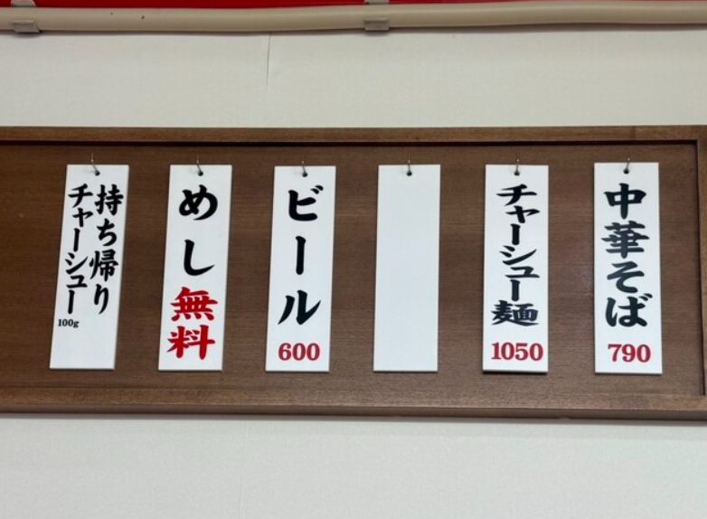 看板メニューは「中華そば」(750円)。清湯醤油スープと中太麺、チャーシュー、ネギ、メンマ、海苔という潔い構成で、ちゃん系ラーメンの原点を感じられる一杯です。肉好きには「チャーシュー麺」がおすすめで、ボリュームのあるチャーシューを存分に堪能できます。軽めに楽しみたい人には「わかめ中華そば」も人気で、あっさりとした風味がスープの軽やかさを引き立てます。トッピングには味玉、追加チャーシュー、ネギ増しなどが用意されており、自分好みにカスタマイズ可能。さらに無料ライスサービスが付くため、スープをかけて雑炊風にしたり、チャーシューをのせて丼風に楽しんだりと食べ方の幅が広がります。シンプルながら満足感をしっかりと提供するメニュー構成が、多くのリピーターを生む要因です。