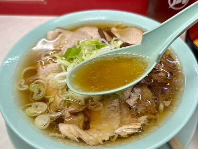 スープは透き通った琥珀色の清湯醤油。豚ガラや鶏ガラをじっくりと炊き出すことで、すっきりとした飲み口ながらも深い旨味を感じさせます。表面に浮かぶラードはスープを熱々に保ちながら、香ばしさとコクをプラス。ひと口飲めば醤油のキレが最初に広がり、その後に動物系の旨味がじんわりと残ります。飲み干せる軽やかさがありながら、満足感をしっかりと与えてくれるため、ランチや夜食、飲み会後の締めにも最適。卓上に置かれたにんにくや辛味調味料を加えることで、スープの印象をガラリと変えられるのも楽しみのひとつです。シンプルでありながら奥深い味わいを持つスープは、「また飲みたい」と思わせる中毒性を秘めています。