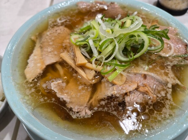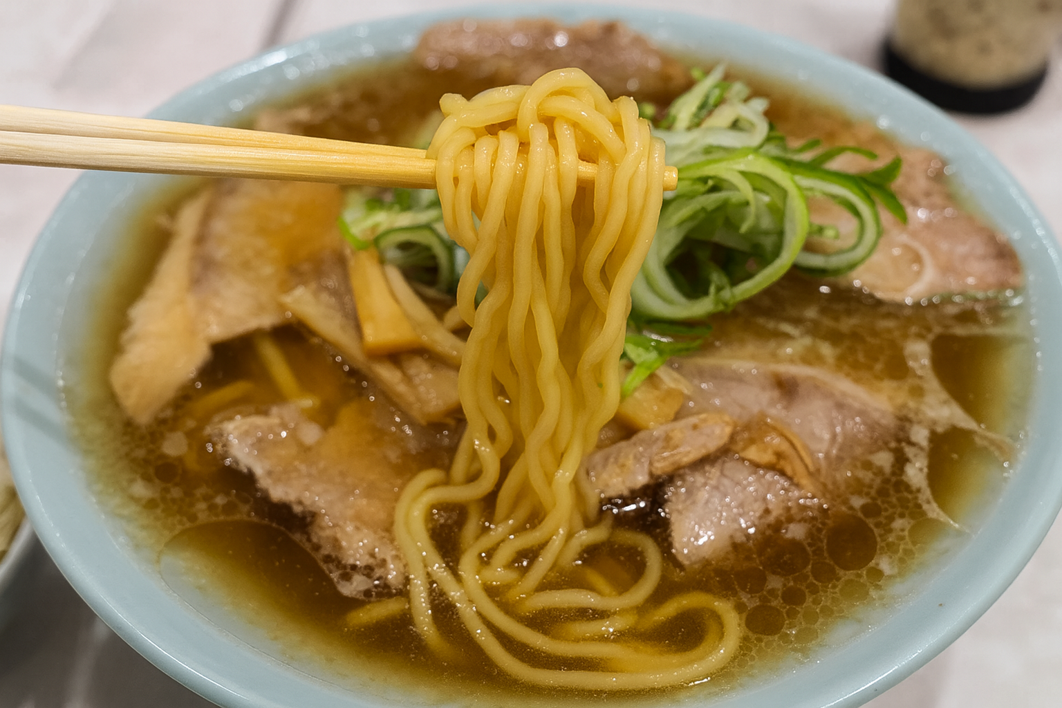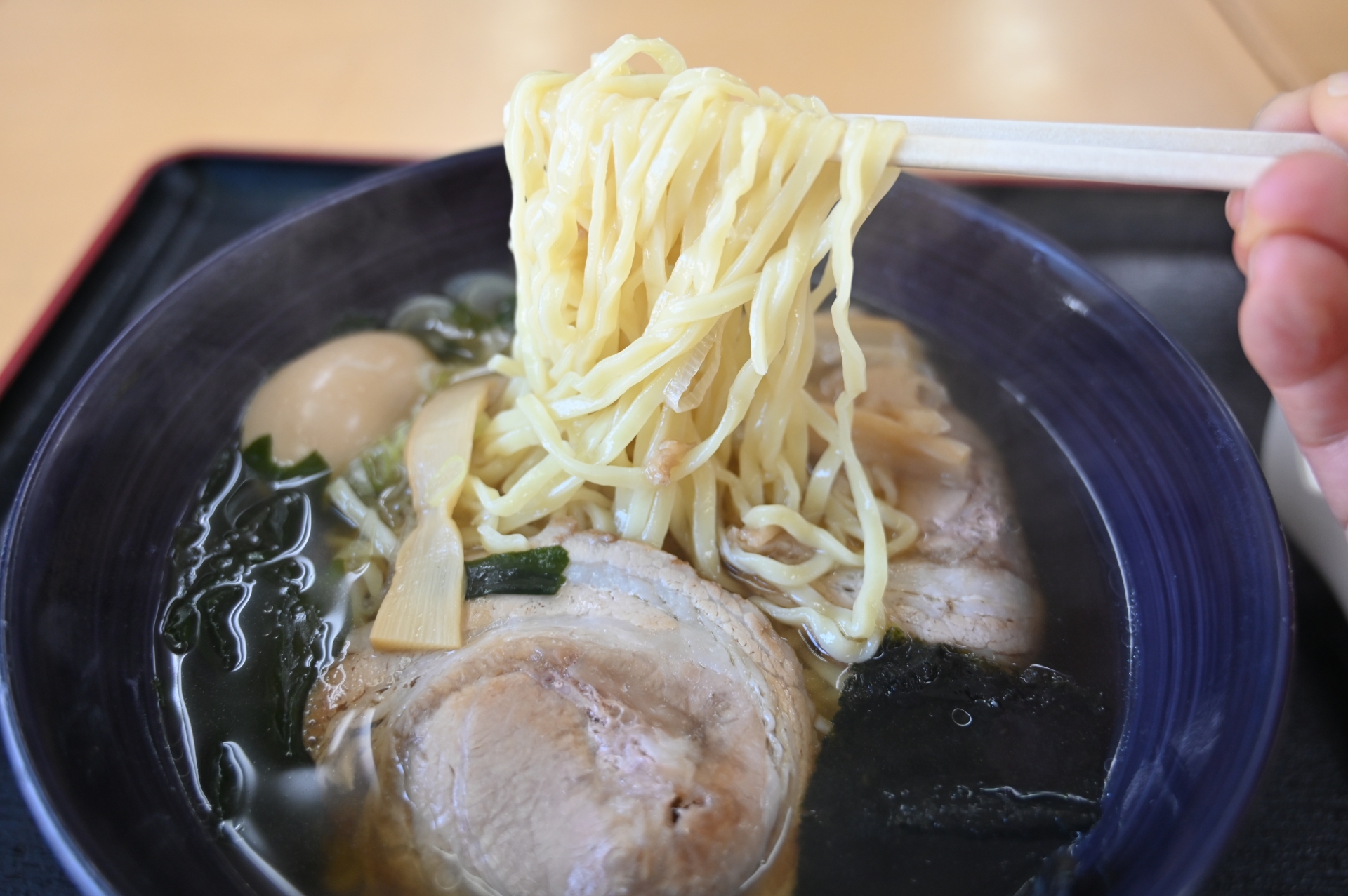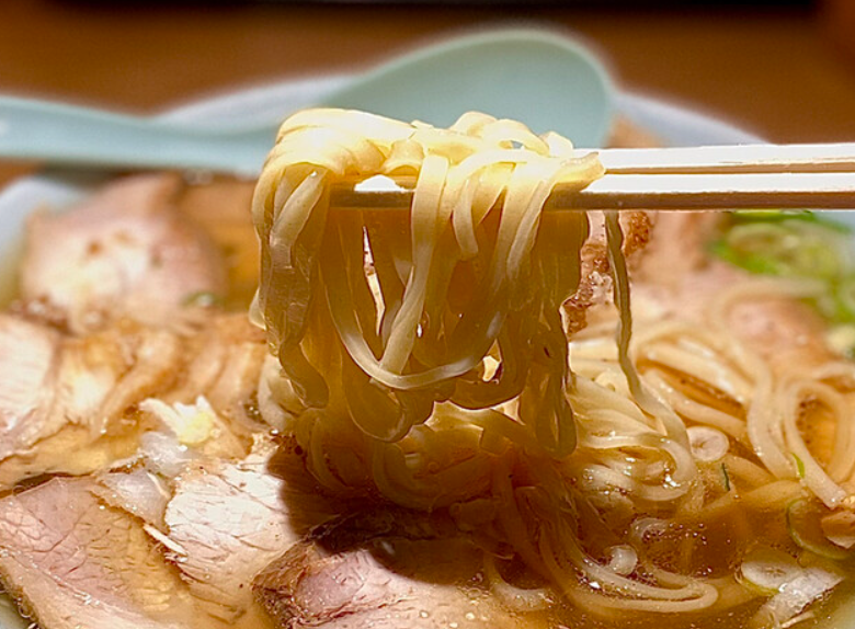 麺は平打ち熟成多加水麺が伝統的。水分量が多く、つるつるとした喉ごしともちもちした弾力が特徴です。熟成させることで独特のコシと風味が生まれ、軽やかなスープとの相性も抜群。一般的な中華麺に比べて少し太めで、表面が滑らかなためスープをしっかりまといながらも、するりと食べられるのが魅力です。食べやすさと心地よい噛み応えのバランスが絶妙で、世代を超えて愛される理由の一つです。