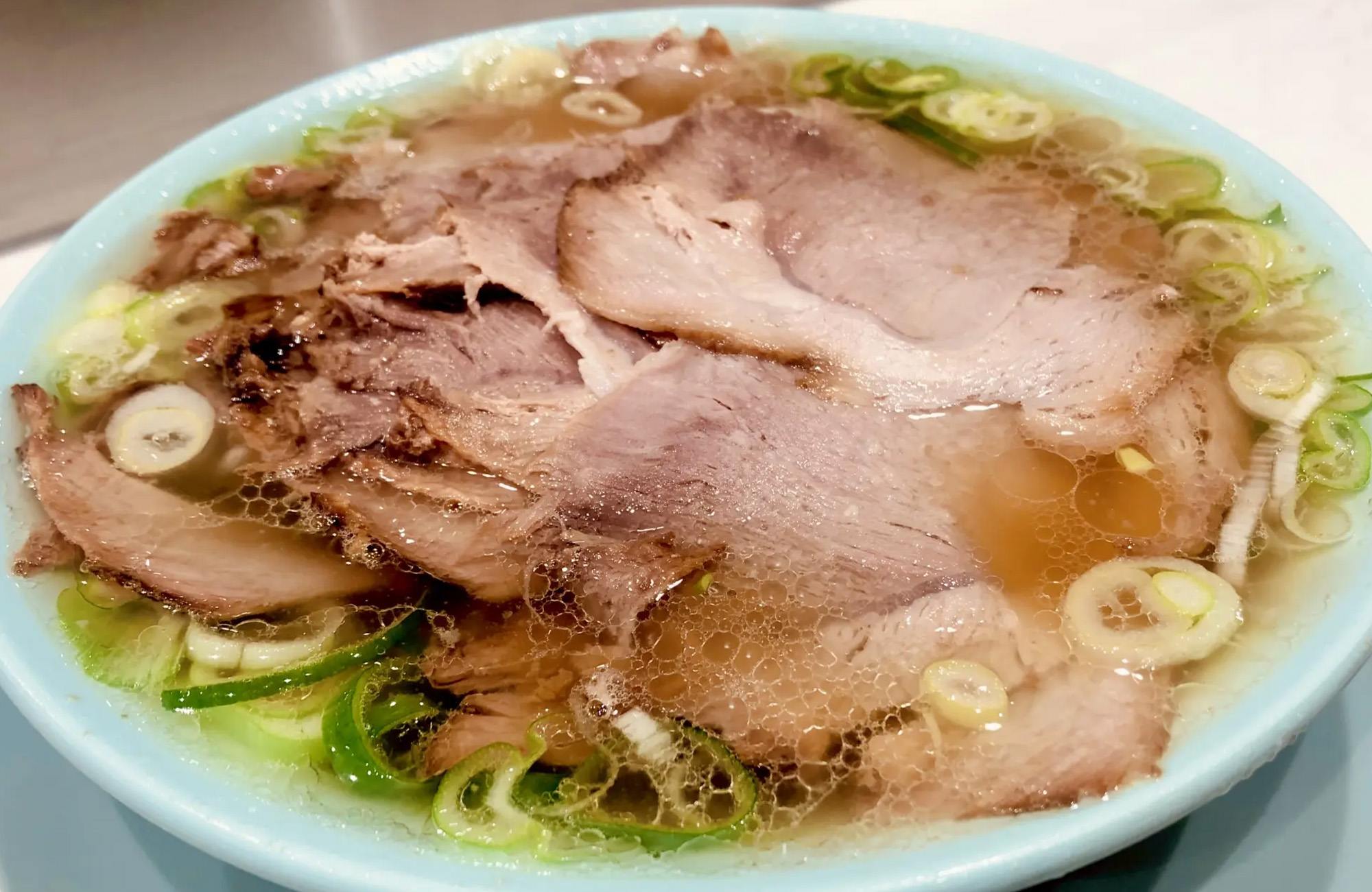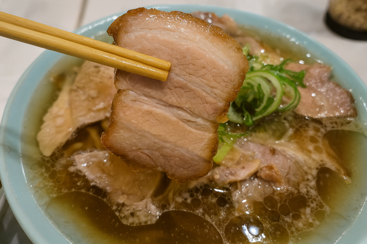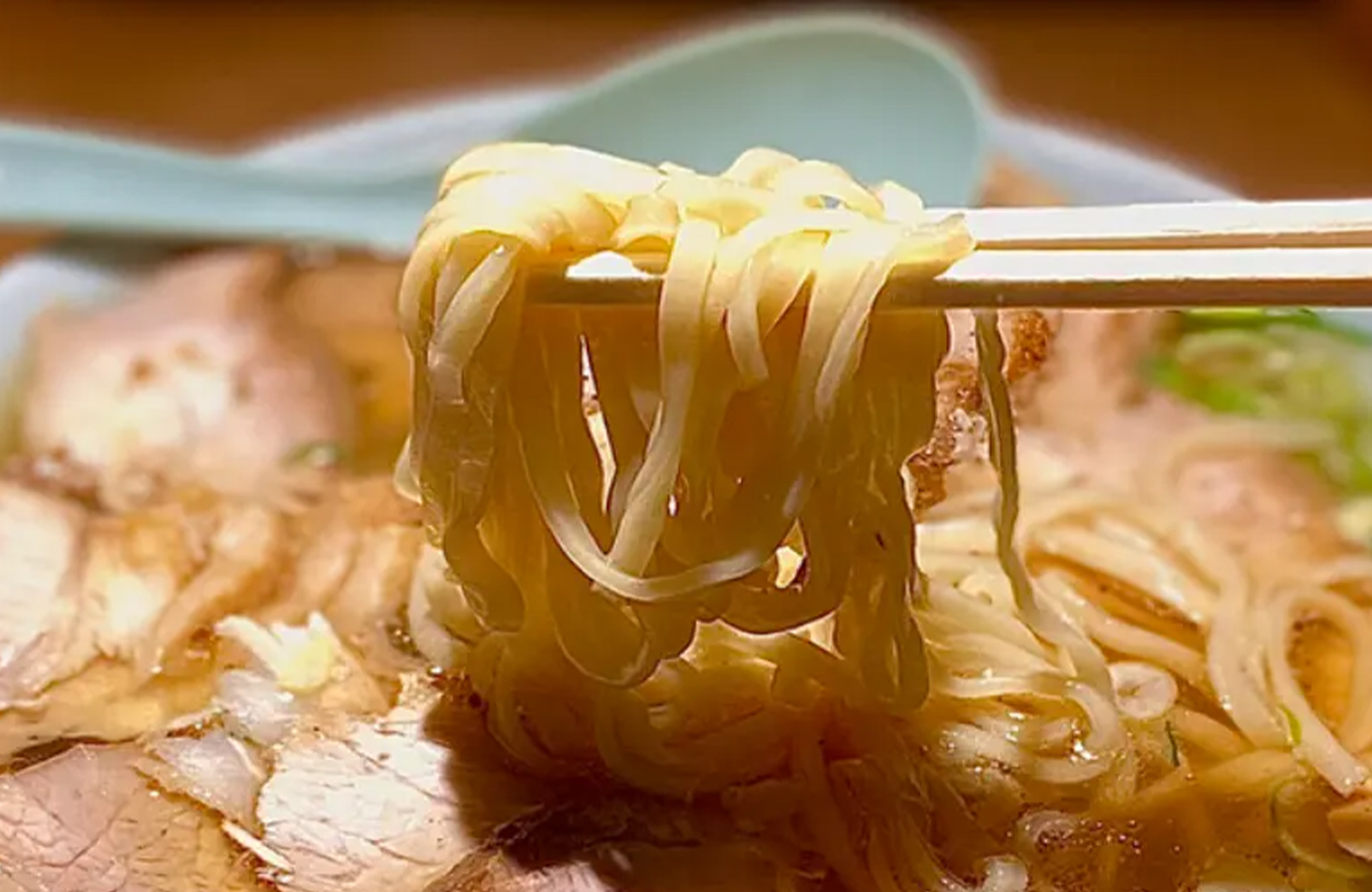 麺は平打ち熟成多加水麺が伝統的。水分量が多く、つるつるとした喉ごしともちもちした弾力が特徴です。熟成させることで独特のコシと風味が生まれ、軽やかなスープとの相性も抜群。一般的な中華麺に比べて少し太めで、表面が滑らかなためスープをしっかりまといながらも、するりと食べられるのが魅力です。食べやすさと心地よい噛み応えのバランスが絶妙で、世代を超えて愛される理由の一つです。
