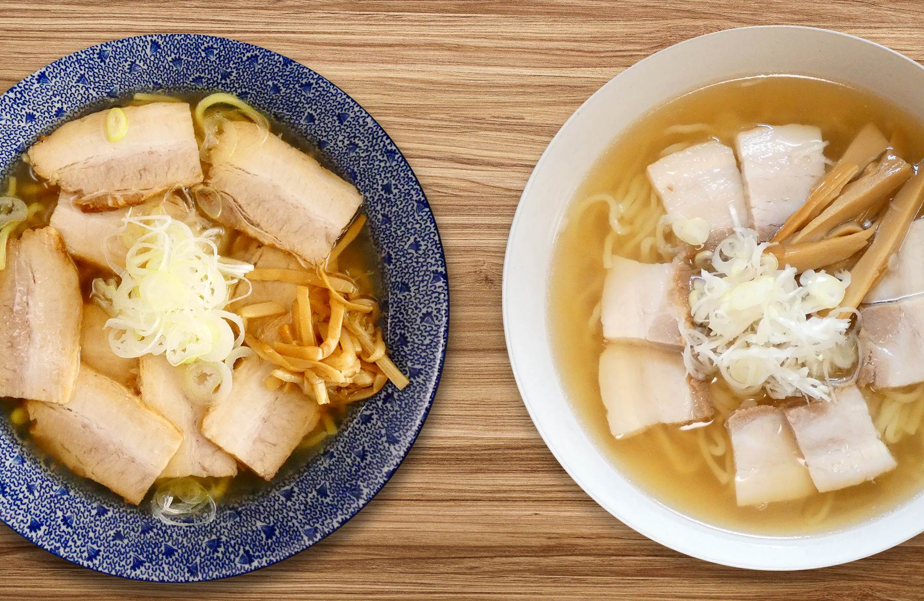 喜多方ラーメンは日本三大ラーメンのひとつで、福島県喜多方市を中心に発展した伝統的な中華そばスタイルです。スープは豚骨や鶏ガラ、煮干しを合わせたあっさり清湯で、平打ち熟成多加水麺のもちもち感が特徴。トッピングはチャーシュー・メンマ・ネギと非常にシンプルで、毎日食べても飽きない優しい味わいが魅力です。ちゃん系ラーメンもまた中華そば系に分類されますが、喜多方に比べるとスープの醤油感が強めで、白ネギ・わかめなど現代的なアレンジを加えている点が異なります。喜多方が「伝統的で地域文化と結びついた中華そば」なのに対し、ちゃん系は「都市部で広がった新興ジャンルの中華そば」。両者は同じルーツを持ちながら、方向性の違いを示す好例です。