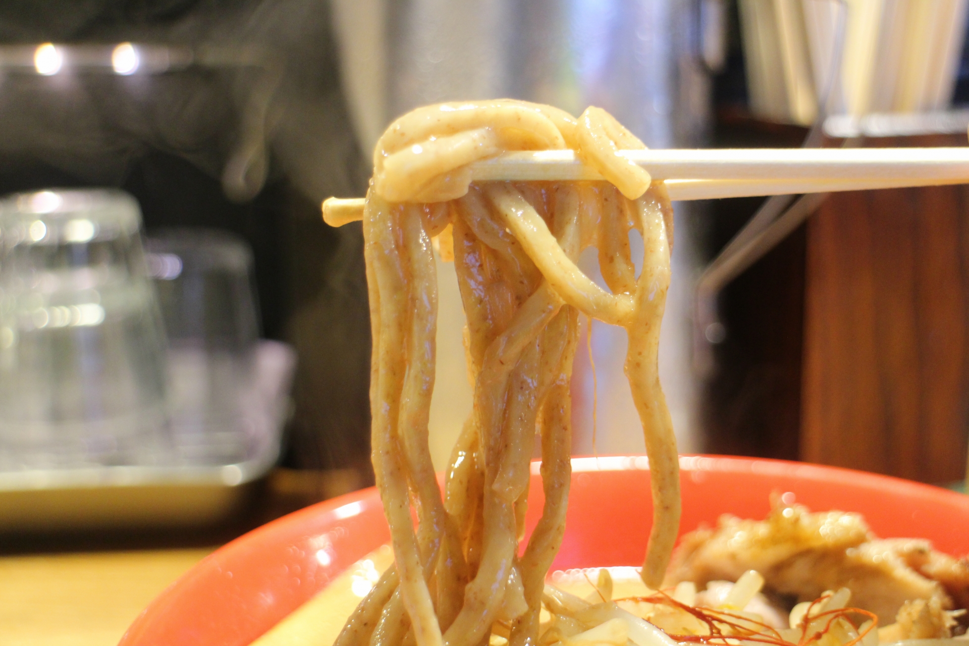 極太麺は加水率が低く、小麦の香りや甘みをダイレクトに感じられます。咀嚼するほどに風味が広がり、濃い味のスープと絶妙なバランスを形成。麺自体が主役級の存在感を持つため、他のラーメンにはない“食べた!”という充実感を与えてくれます。