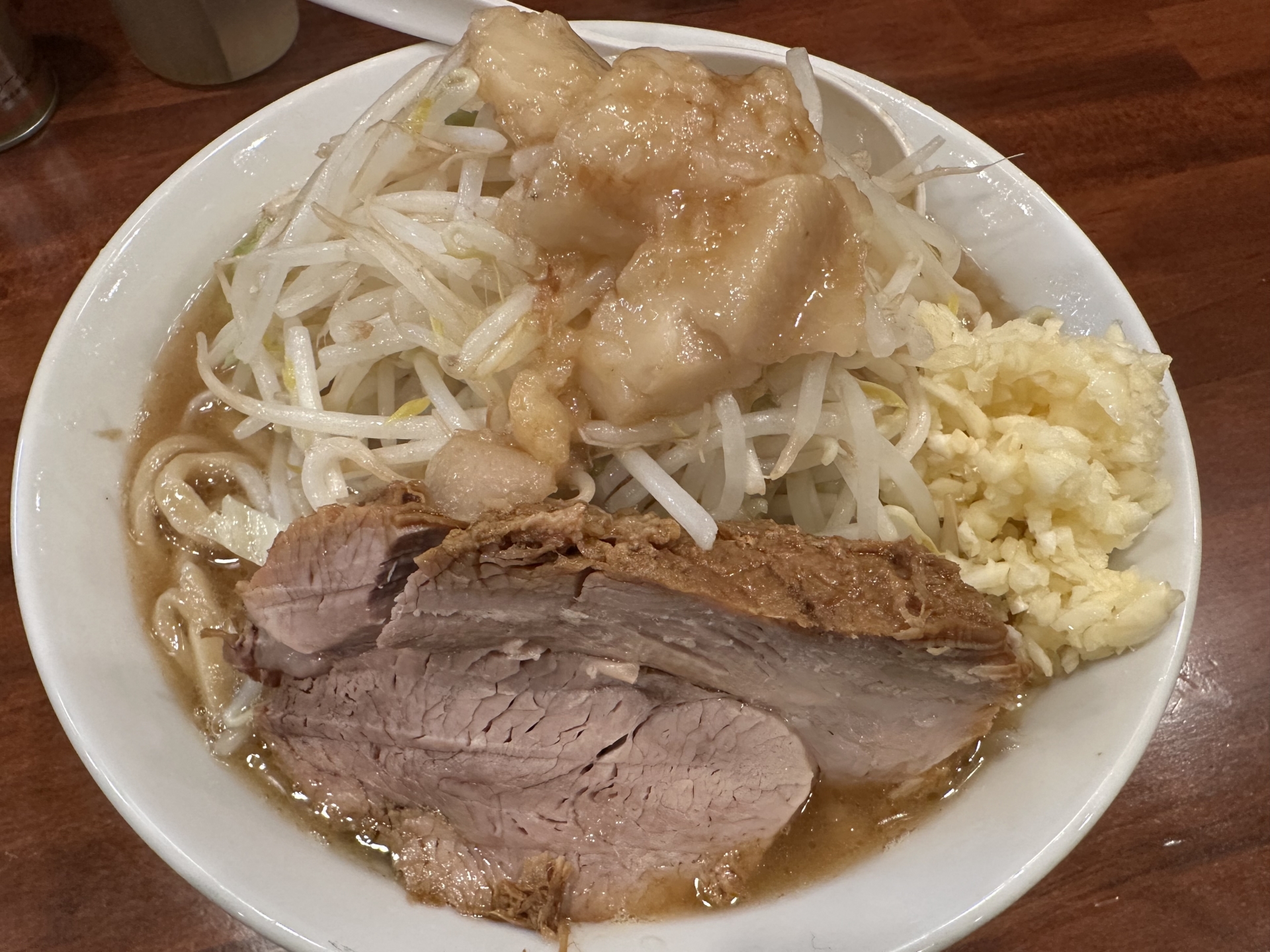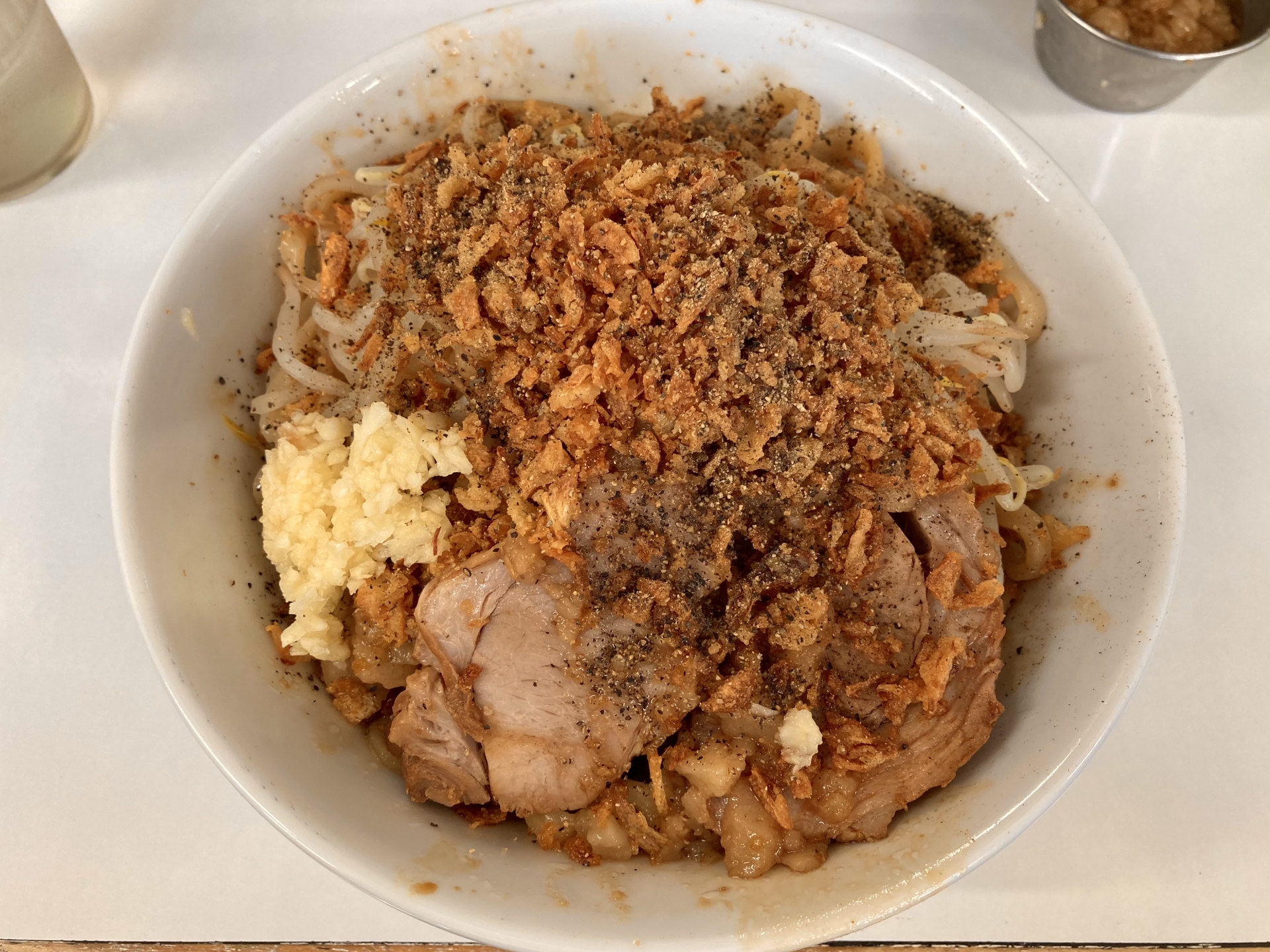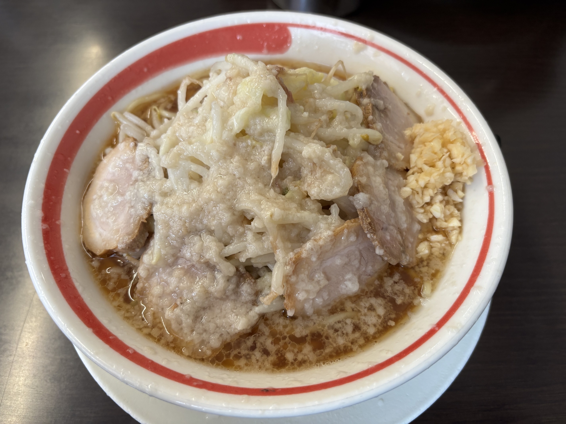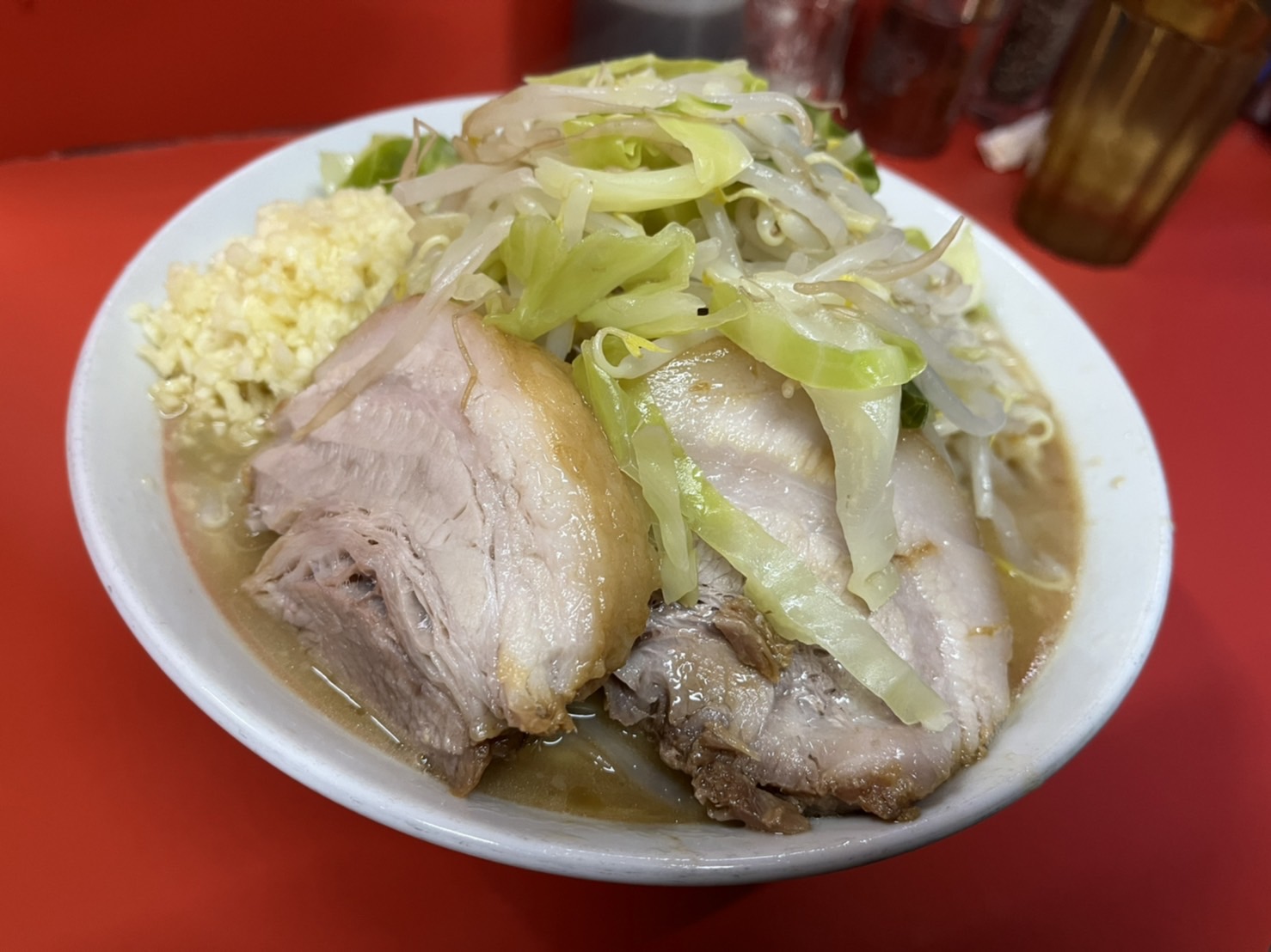コールで「ヤサイマシ」「ヤサイマシマシ」と指定すれば、丼からあふれんばかりの野菜が積み上がります。見た目のインパクトは圧巻ですが、シャキシャキ感が濃厚スープを中和するため意外と食べやすいのが特徴。ただし増やしすぎると麺にたどり着くまでに時間がかかり、伸びやすくなるので、途中で“天地返し”をして麺と野菜を混ぜるのが食べやすくするコツです。