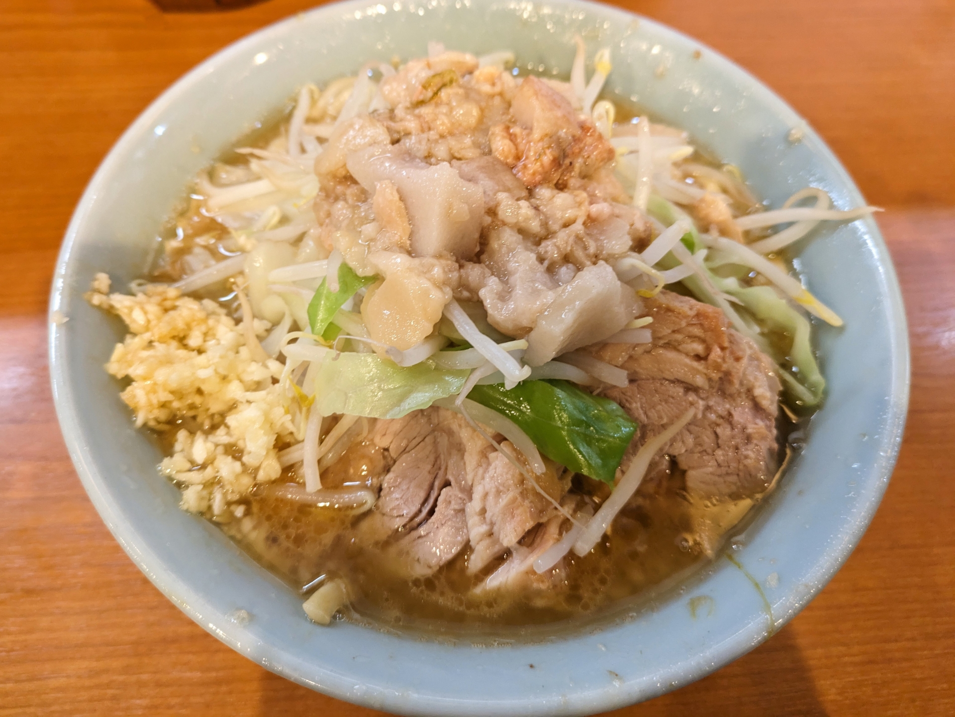 「アブラマシ」をコールすれば、スープ表面に背脂がたっぷりと浮かび、こってり感が倍増します。野菜の上にかけられることも多く、甘みのある背脂とシャキシャキ野菜の組み合わせは相性抜群。こってり好きにはたまらない一杯に仕上がりますが、食べ切れるかどうかのバランスを見極めることも大切です。