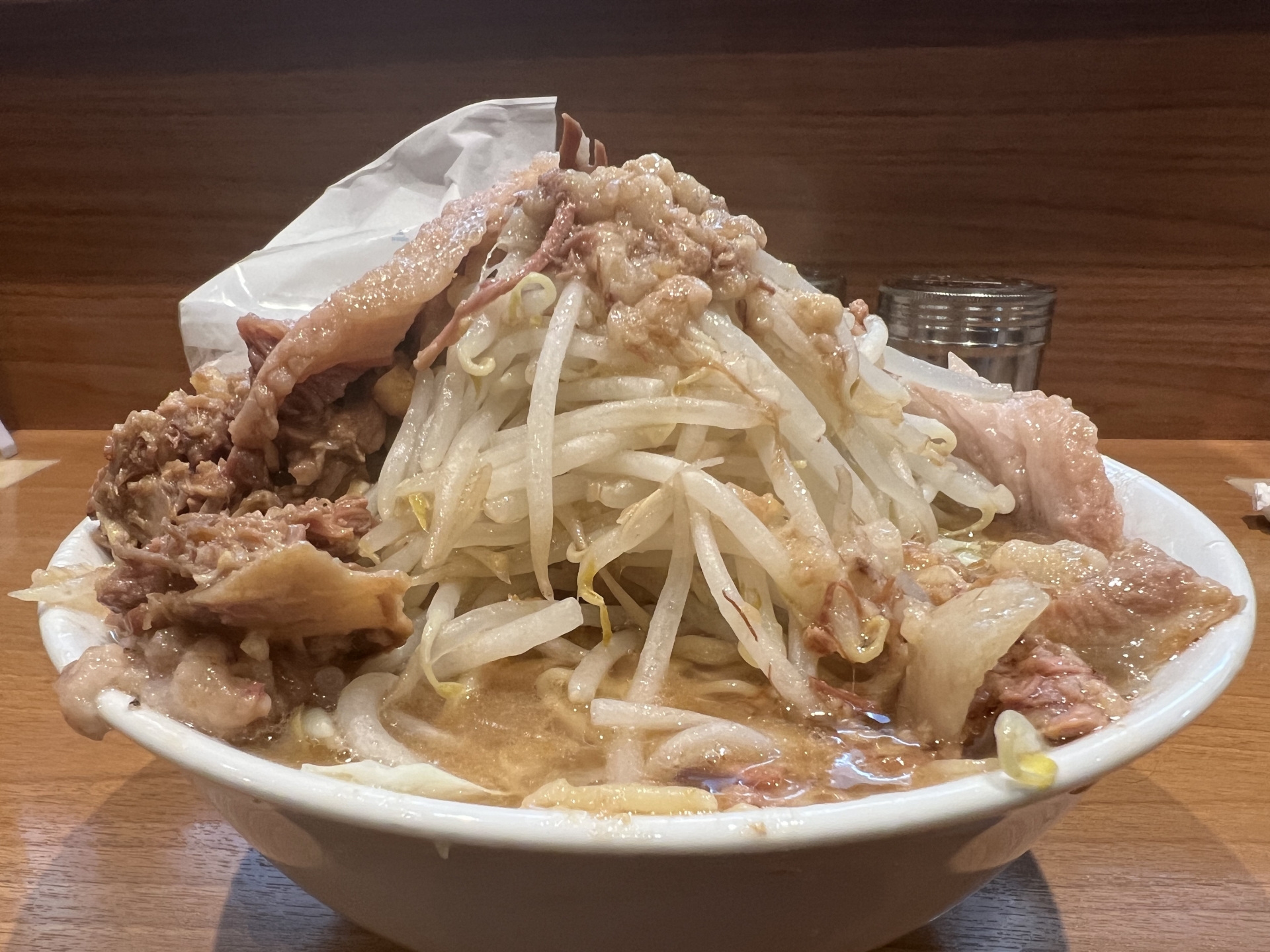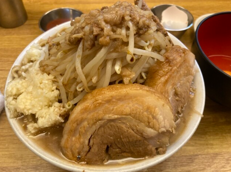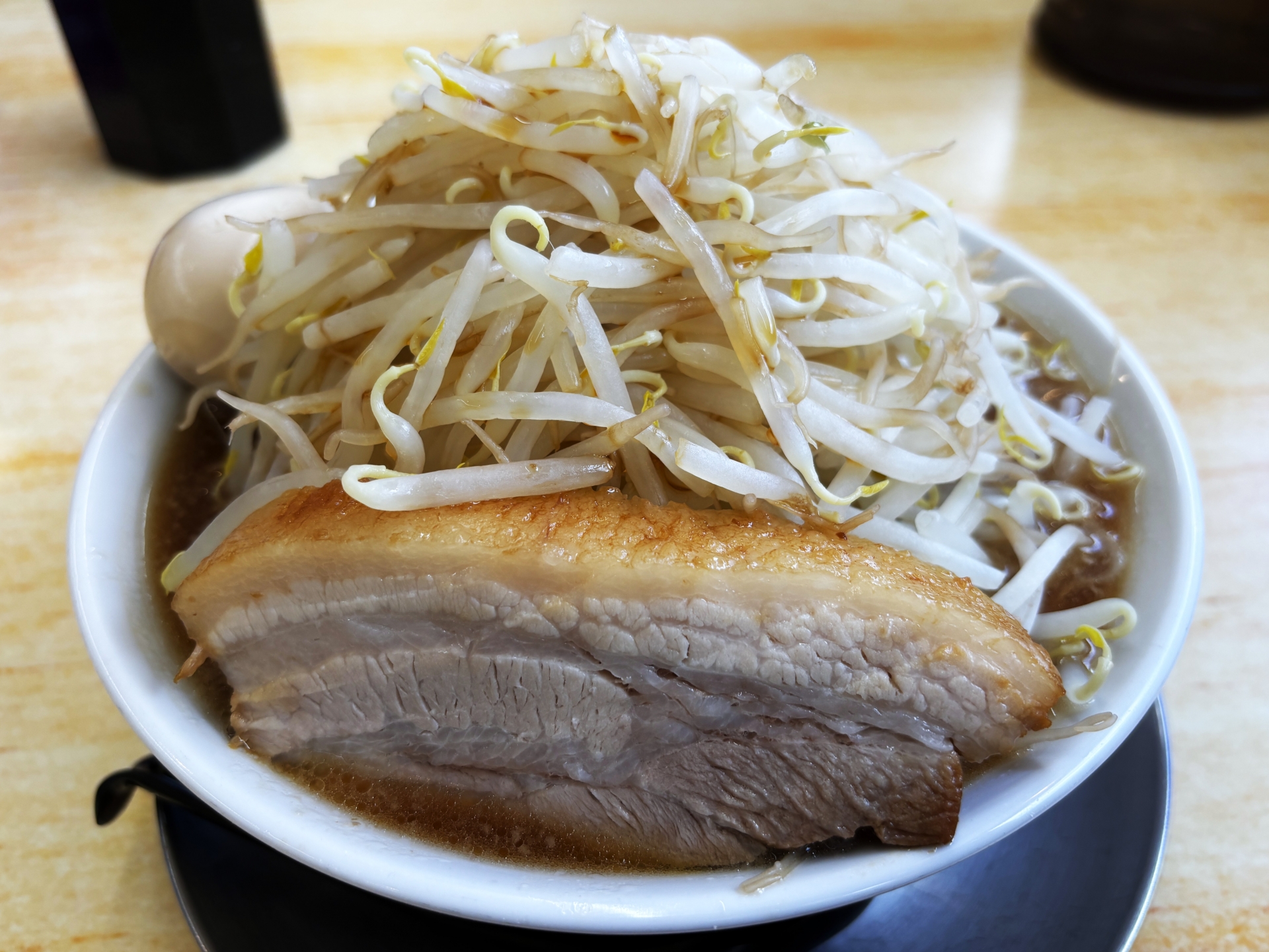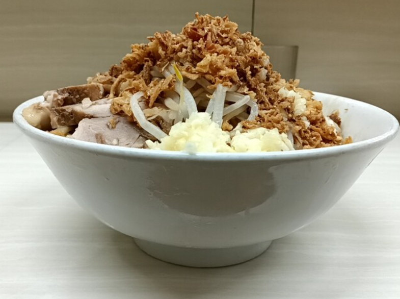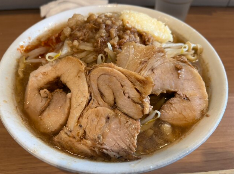 「地球規模で考えろ」は、ユニークな名前と豪快なラーメンで知られるインスパイア系。スープは超濃厚で塩分も強め、極太麺との相性は抜群です。野菜は山盛り、豚は分厚くジューシーで、圧倒的なボリューム感を誇ります。店名通りのスケール感を味わえる一杯は、まさに「挑戦型ラーメン」といえる存在。口コミでは「胃袋との戦いになるがクセになる」と評されるほどで、関西二郎系ファンの間で絶大な人気を誇ります。