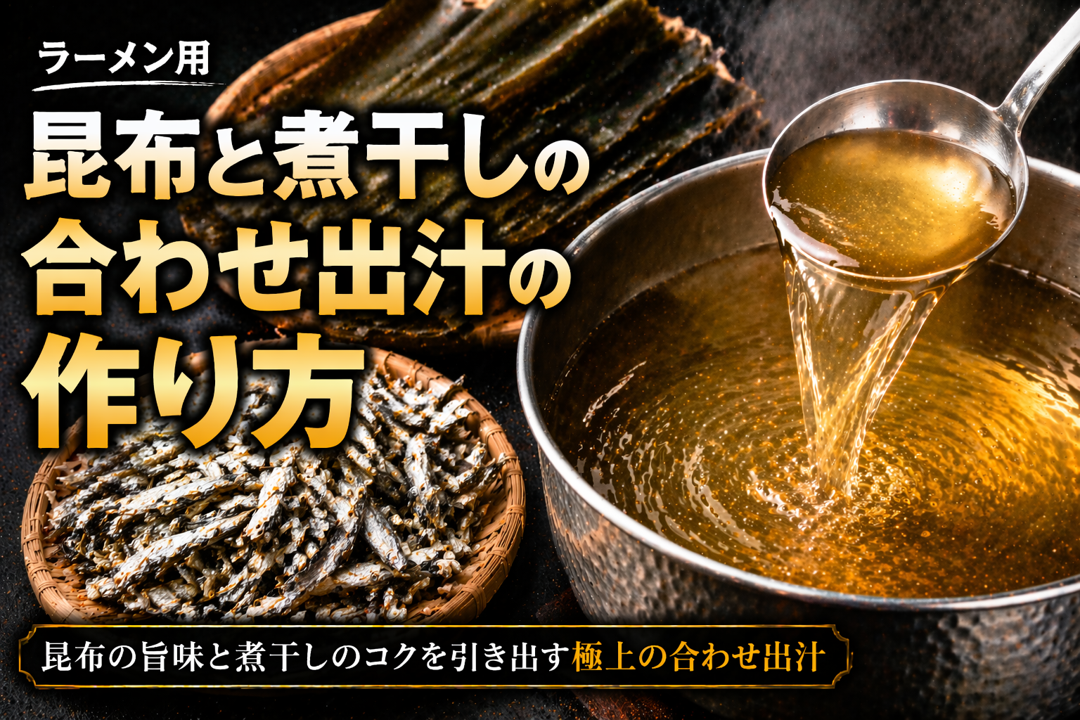 昆布と煮干しの合わせ出汁とは、昆布由来のグルタミン酸と煮干し由来のイノシン酸および脂質・香り成分を組み合わせることで、旨味の強度と持続性を同時に高める出汁設計であり、その特徴はクリアな土台と力強いコクの両立にあるが、本質は異なる性質の旨味成分の相互補完にある。まず論点として重要なのは、昆布は雑味の少ない安定した旨味を形成する一方で、味の立ち上がりが穏やかであるのに対し、煮干しは短時間で強い旨味と香りを付与できるため、両者を組み合わせることで「土台」と「主張」を同時に成立させられる点である。次に分解すると、一般的には昆布を低温で抽出してベースを構築し、その後に煮干しを加えて旨味を補強する方法が取られるが、この順序や温度設定を誤ると、煮干しの苦味や昆布のえぐみが前面に出るリスクがある。この違いは脂質の溶出条件とグルタミン酸の安定性に起因する構造的な問題である。さらに整理すると、昆布は味の「持続性」と「安定性」を担い、煮干しは「立ち上がり」と「輪郭」を形成する役割を持つため、両者は競合ではなく機能分担された関係にある。このように、昆布と煮干しの合わせ出汁は、シンプルでありながら旨味の密度とバランスを高次元で成立させる設計手法であり、ラーメンにおいては再現性と完成度を両立させるための基本かつ重要なアプローチとして位置付けられる。