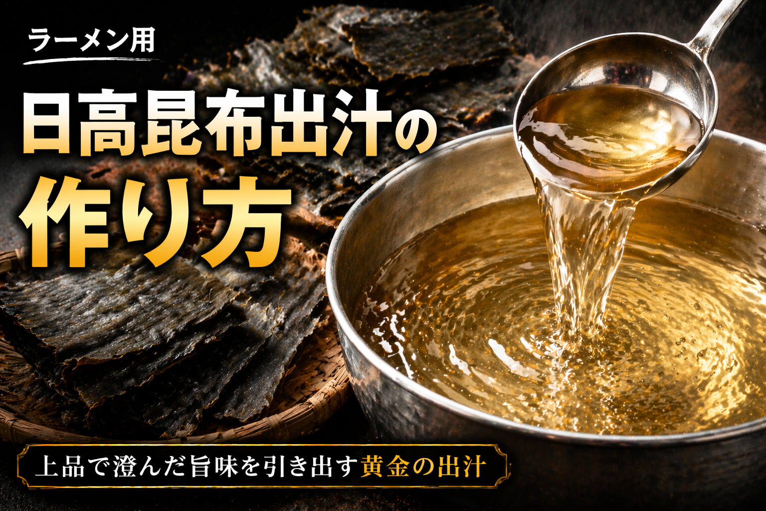 日高昆布出汁とは、北海道日高地方で採れる日高昆布から旨味成分を抽出した出汁であり、その特徴はバランスの取れた旨味と柔らかな風味、そして扱いやすさにあるが、本質は成分の安定性と抽出の再現性の高さにある。まず論点として重要なのは、日高昆布は真昆布や利尻昆布と比較してグルタミン酸の含有量がやや穏やかである一方、繊維が柔らかく成分が溶出しやすいため、比較的短時間でも安定した旨味を得やすい点であり、これにより調理工程のブレを抑えやすい構造を持つ。次に分解すると、日高昆布は低温抽出でも十分な旨味を引き出せるが、中温帯での加熱にも耐性があり、多少の温度変動があってもえぐみや雑味が出にくいという特徴を持つ。この違いはアルギン酸などの副成分の溶出が比較的穏やかであることに起因する。さらに整理すると、日高昆布出汁は突出した個性はないものの、味の土台としての安定性が高く、魚介系や動物系出汁と組み合わせた際に全体のバランスを整える役割を担う。このように、日高昆布出汁は強さやキレよりも「扱いやすさ」と「再現性」に価値を持つ出汁であり、ラーメンにおいては安定した品質を維持するための基盤として、実務的にも重要な位置を占める存在として位置付けられる。