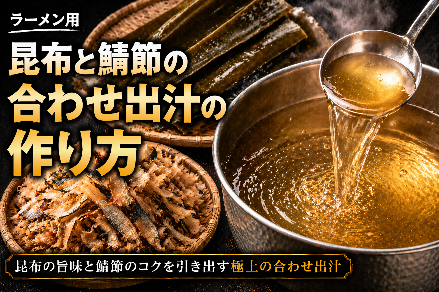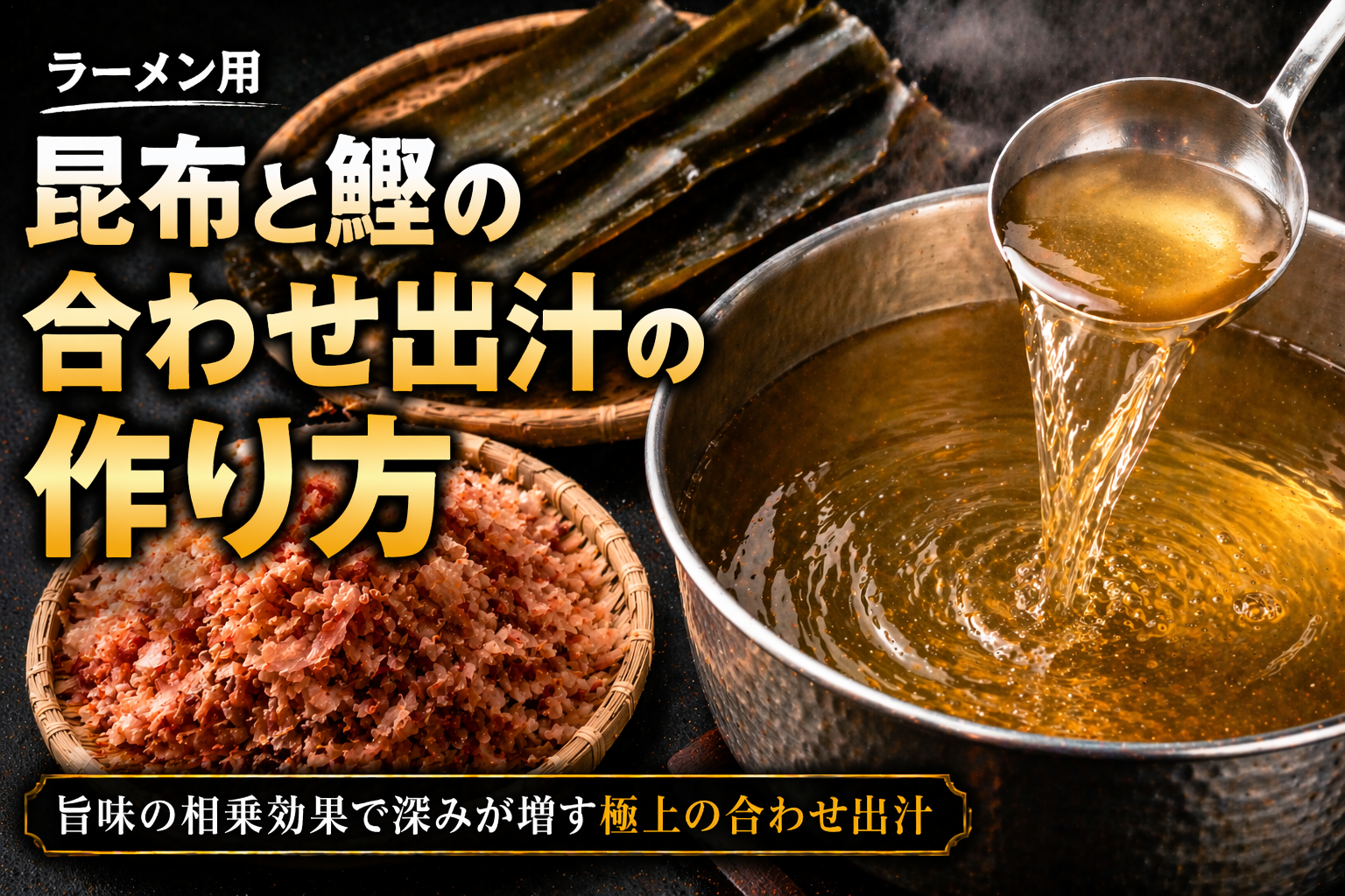 昆布と鰹の合わせ出汁とは、昆布由来のグルタミン酸と鰹節由来のイノシン酸を組み合わせることで、旨味の相乗効果を最大化する出汁構造であり、日本の出汁文化の中核を成す基本形であるが、その本質は異なる旨味成分の補完関係にある。まず論点として重要なのは、グルタミン酸とイノシン酸が同時に存在することで、単体では得られない強い旨味が知覚される点であり、これは単なる加算ではなく、味覚上の増幅として機能する構造を持つ。このため、昆布と鰹の組み合わせは最も効率的に旨味を引き出す設計とされる。次に分解すると、一般的には昆布を低温で時間をかけて抽出し、その後に鰹節を加えて短時間で旨味と香りを付与する工程が取られるが、この順序と温度管理が崩れると、昆布のえぐみや鰹の雑味が出やすくなる。この違いはグルタミン酸の安定性と、鰹節の揮発性香気成分の扱い方に起因する構造的な問題である。さらに整理すると、昆布は味の「土台」と「持続性」を担い、鰹は「立ち上がり」と「香り」を形成する役割を持つため、両者は対等ではなく機能分担された関係にある。このように、昆布と鰹の合わせ出汁は、旨味の相乗効果を軸にした合理的な出汁設計であり、ラーメンにおいても味の密度とバランスを高い精度で成立させるための基本かつ重要なアプローチとして位置付けられる。