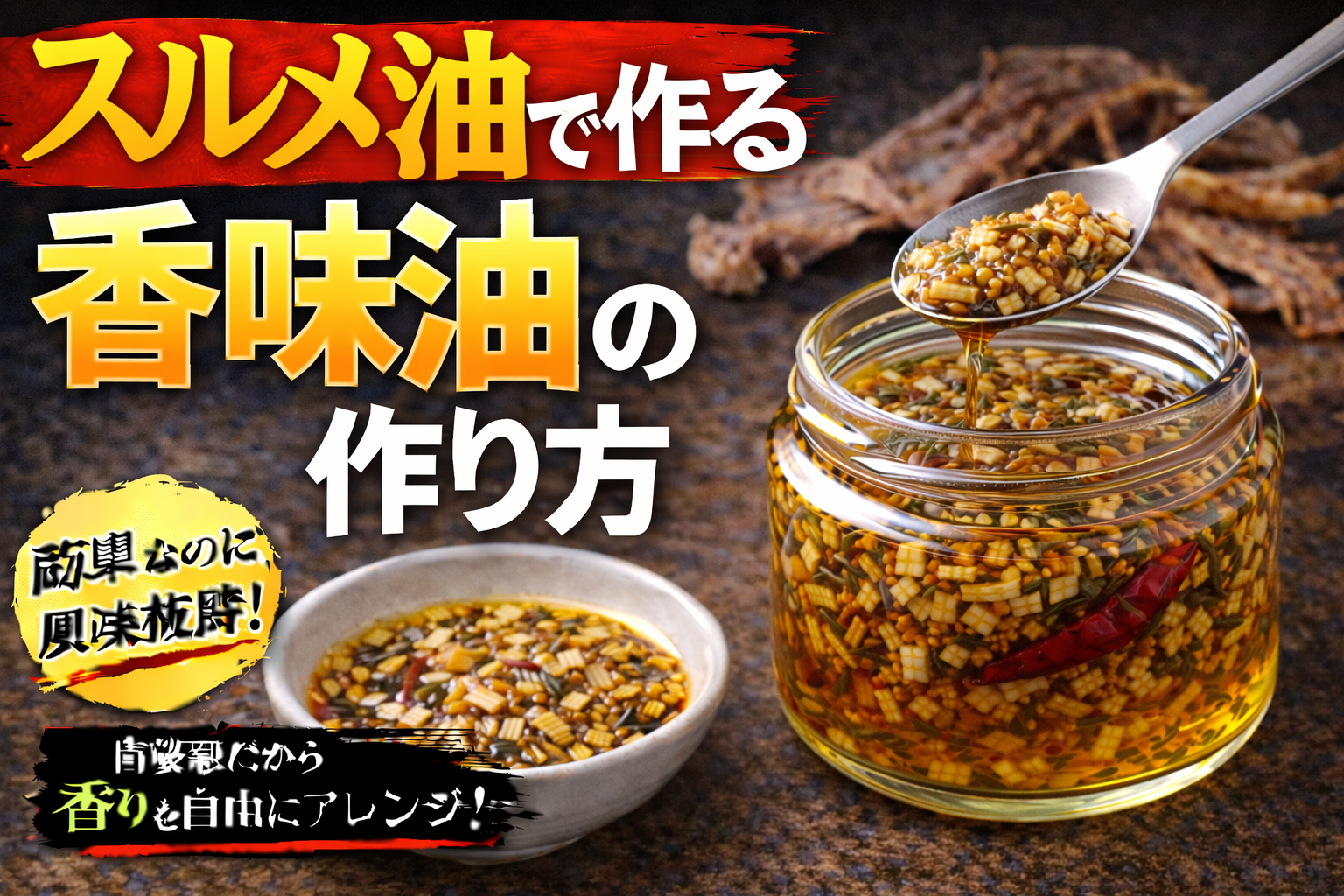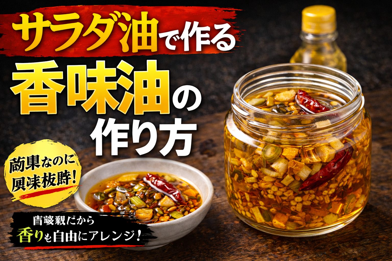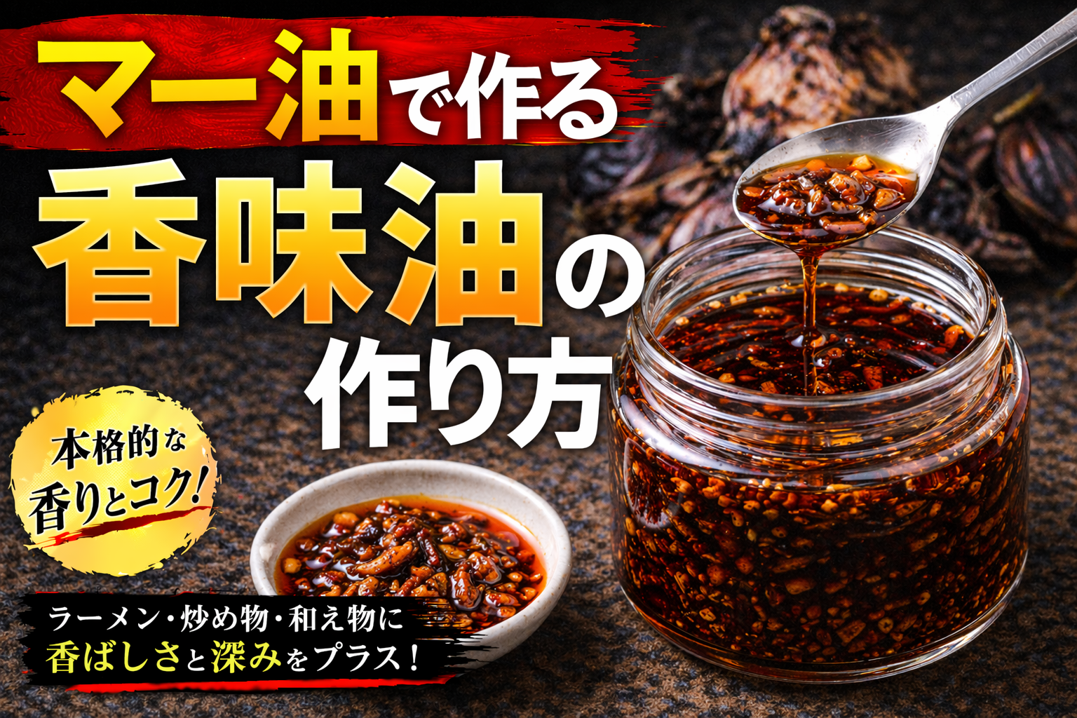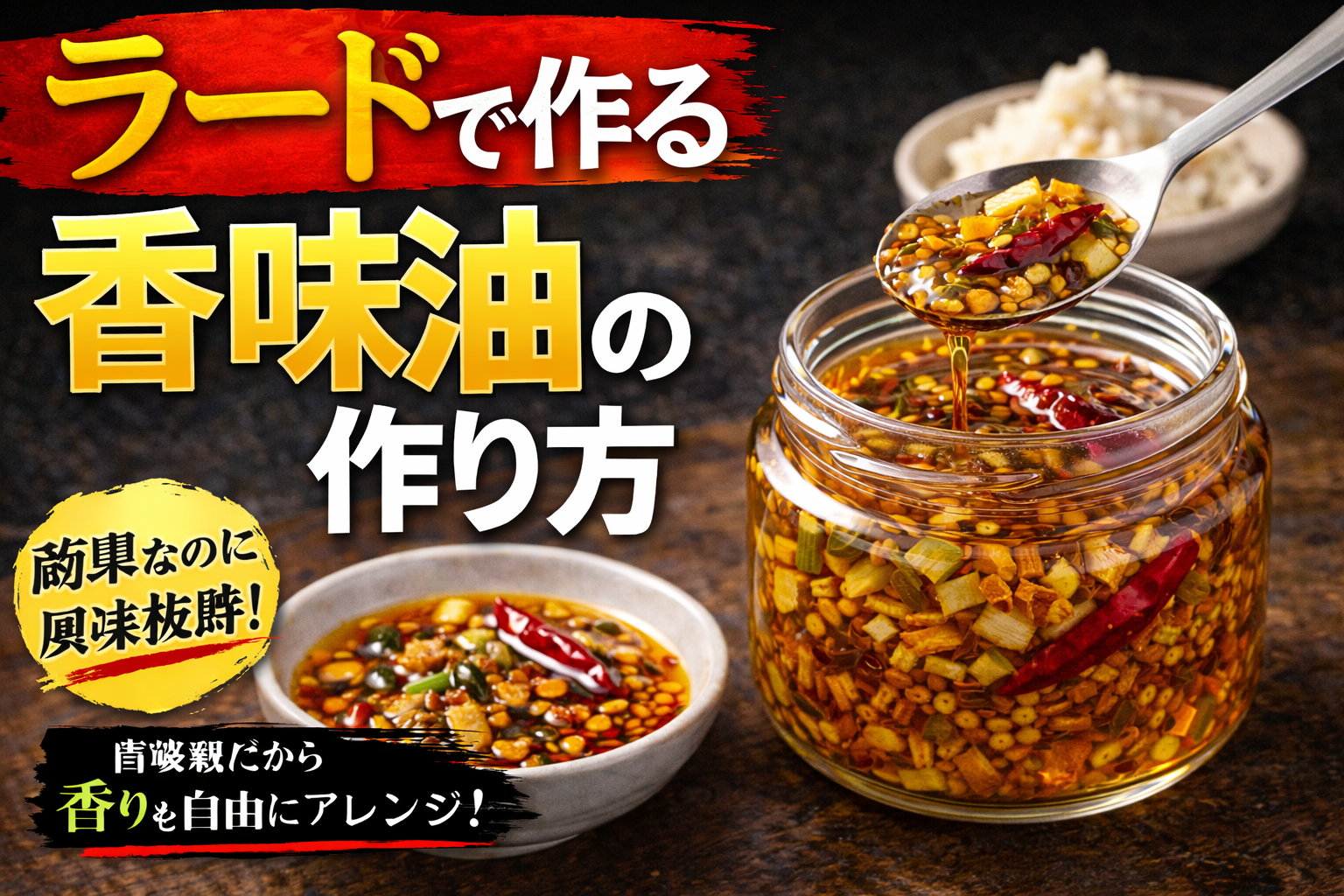 香味油は、ネギやニンニク、スパイスなどを油で低温からじっくり加熱し、香りを抽出して濾すことで作る。加熱温度や時間により風味が大きく変わるため、焦がさず丁寧に仕上げることが重要である。