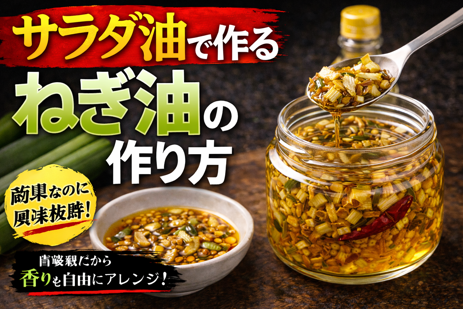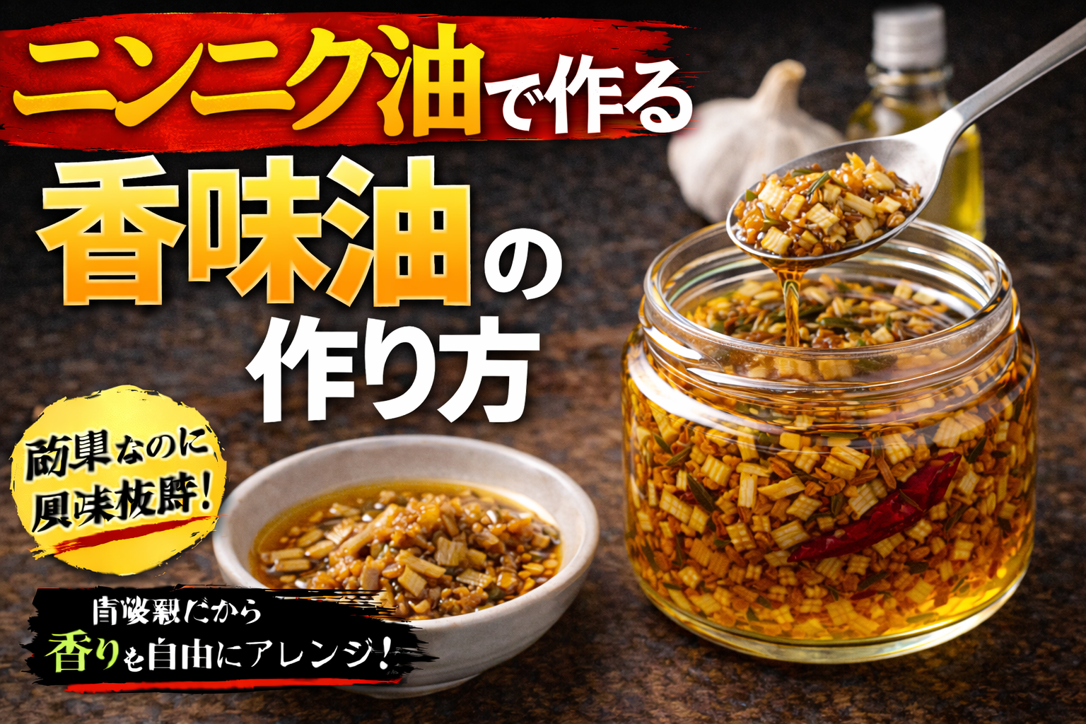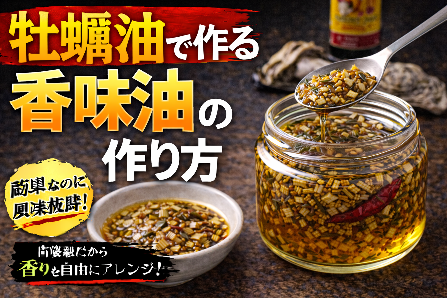 香味油は、ネギやニンニク、スパイスなどを油で低温からじっくり加熱し、香りを抽出して濾すことで作る。加熱温度や時間により風味が大きく変わるため、焦がさず丁寧に仕上げることが重要である。