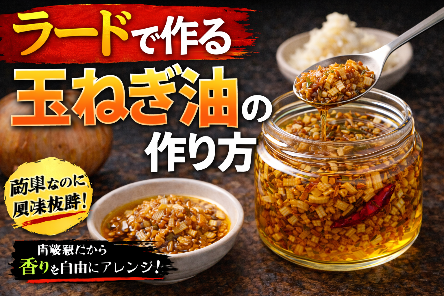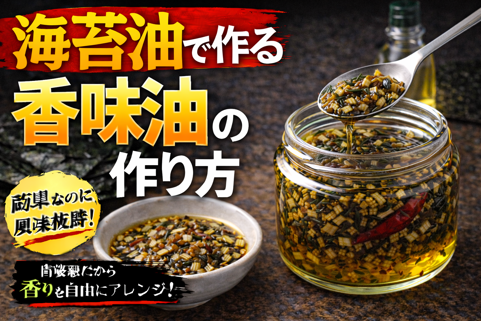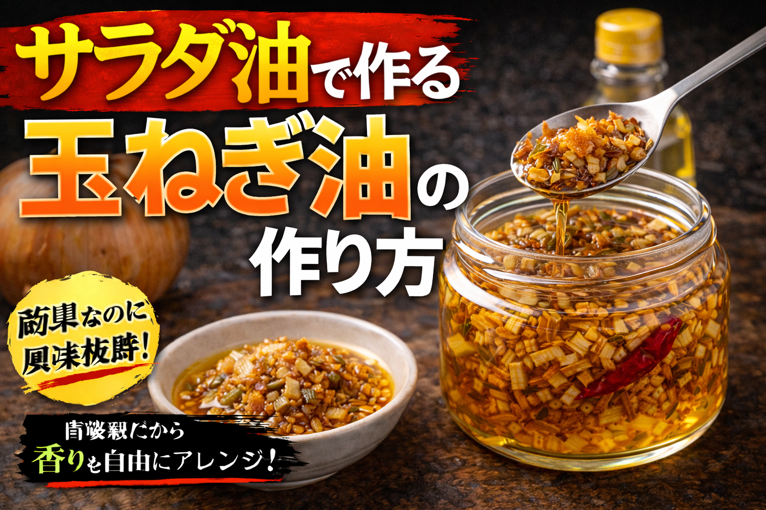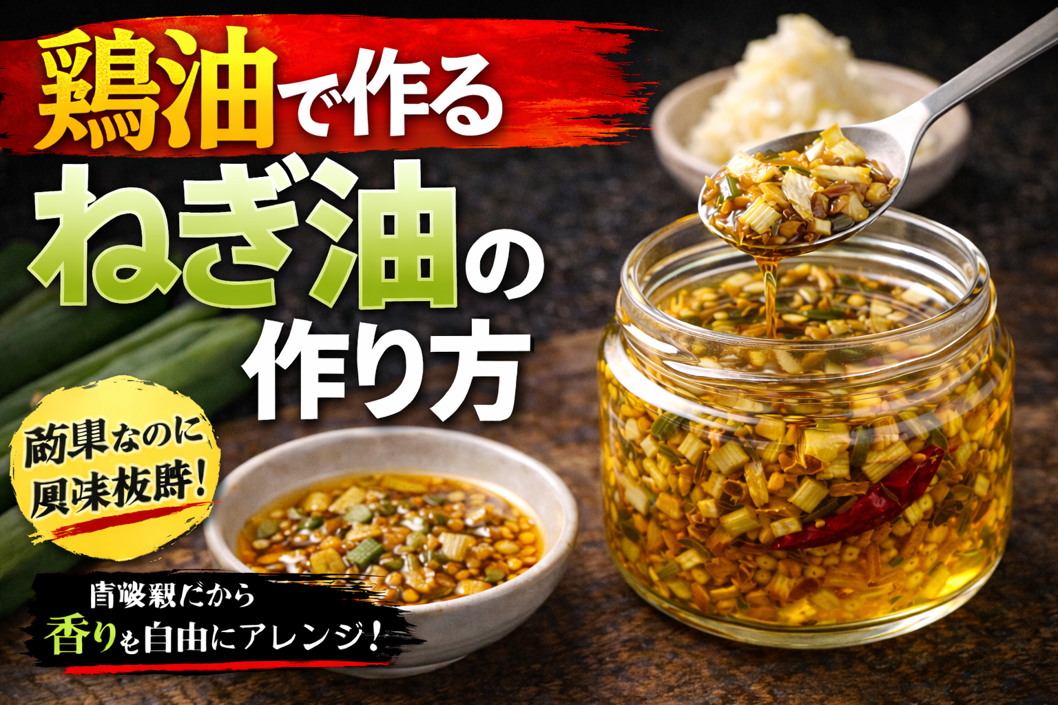 香味油は、ネギやニンニク、スパイスなどを油で低温からじっくり加熱し、香りを抽出して濾すことで作る。加熱温度や時間により風味が大きく変わるため、焦がさず丁寧に仕上げることが重要である。