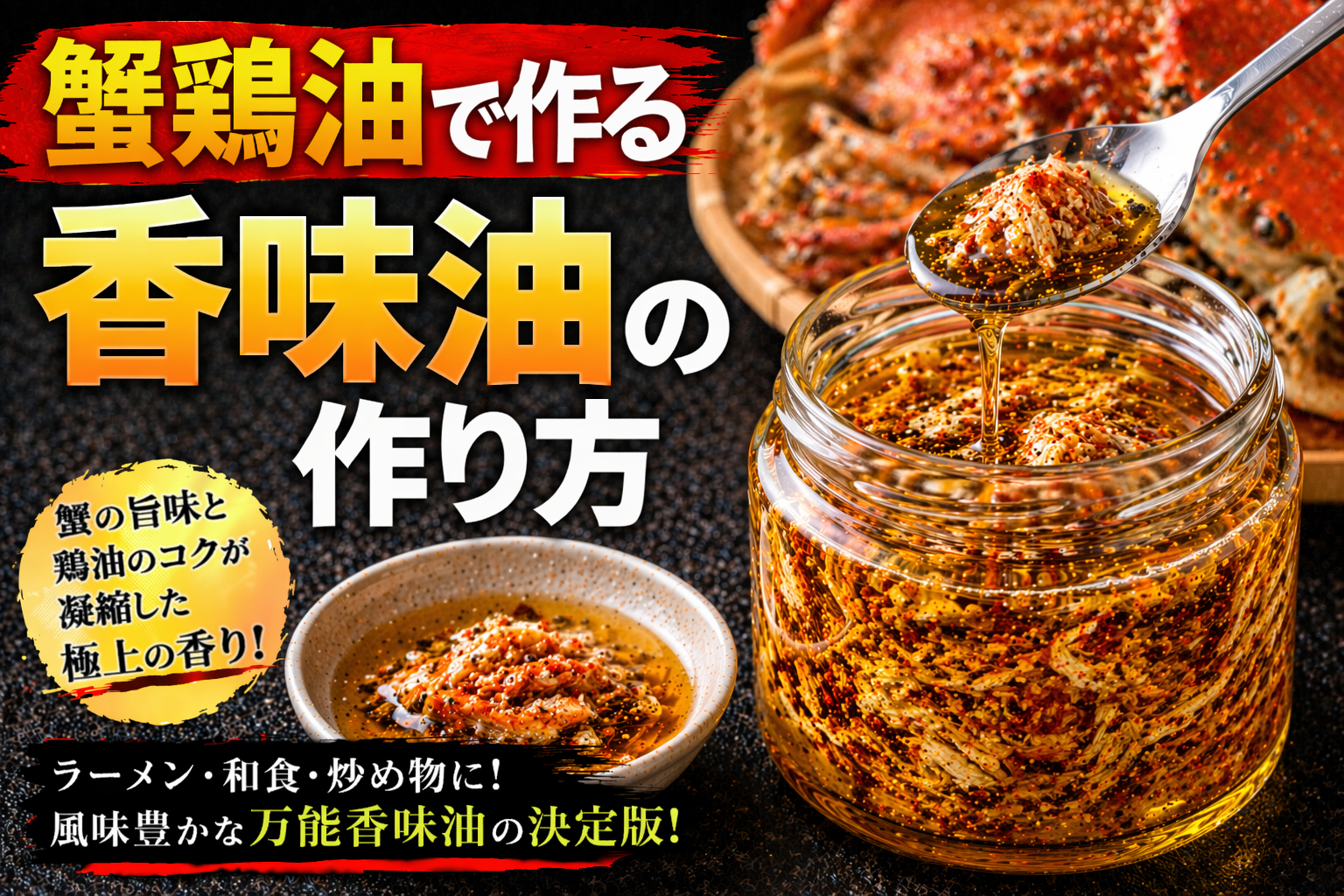 蟹鶏油とは、鶏の脂から抽出した鶏油に蟹の身や殻を加え、低温でじっくり加熱して旨味と香りを移した調味油のこと。鶏のコクと蟹の濃厚で甘みのある風味が合わさり、奥深い味わいが特徴で、ラーメンや炒め物、和え物などに豊かな旨味を加える。料理の質を高める風味油である。
