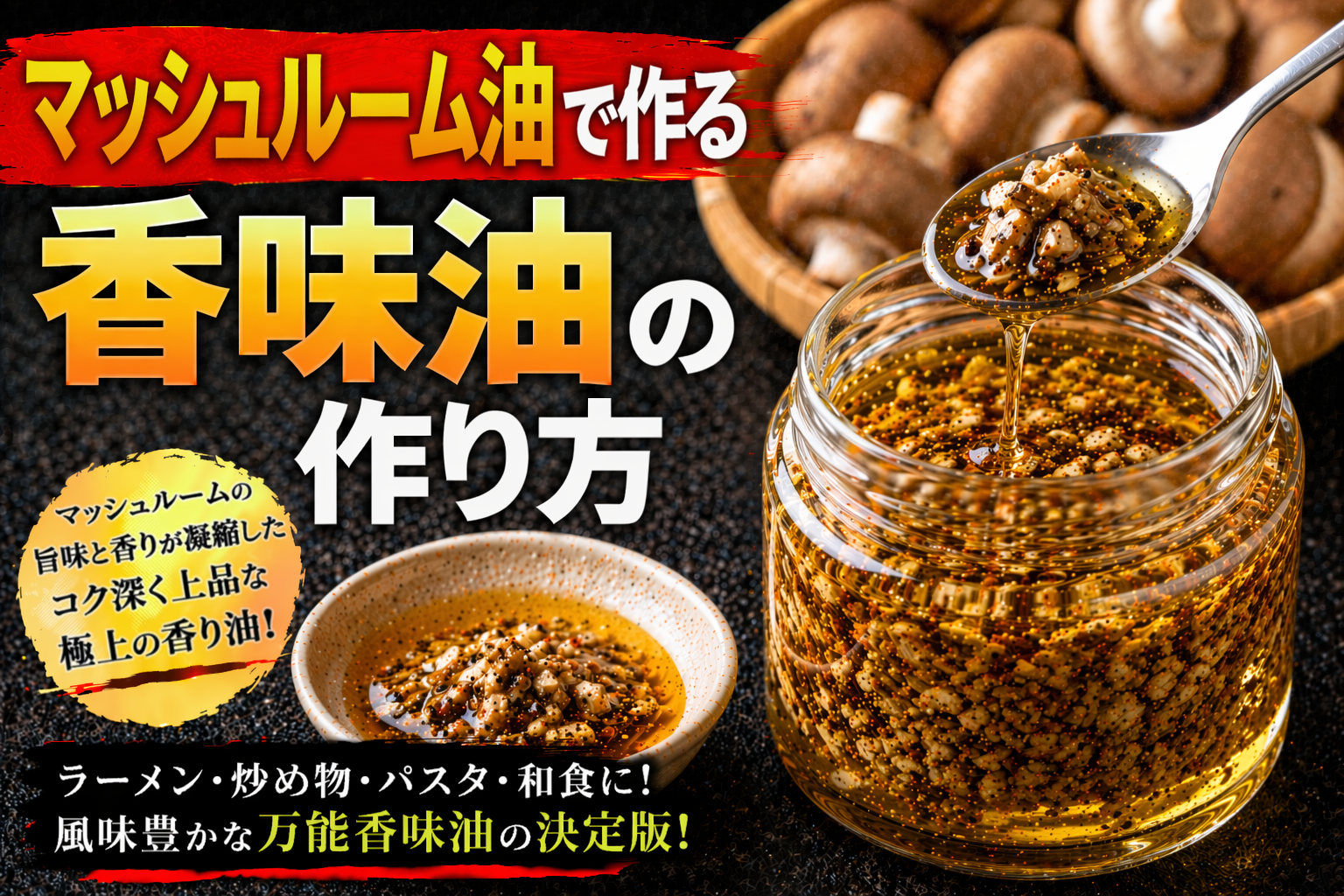 マッシュルーム油とは、マッシュルームを刻んで油でじっくり加熱し、旨味や香りを移した香味油のこと。加熱により独特の芳醇な香りとコクが引き出される。ラーメンや洋風料理、炒め物に加えることで、料理に深みと豊かな風味を与える調味油として用いられる。