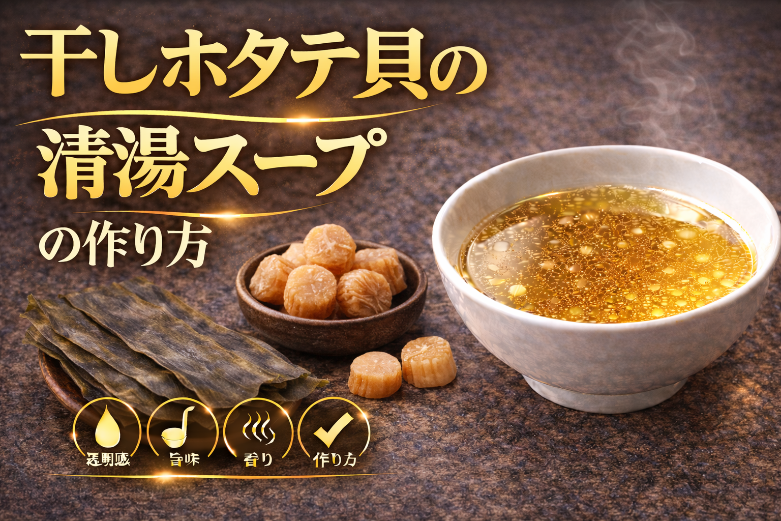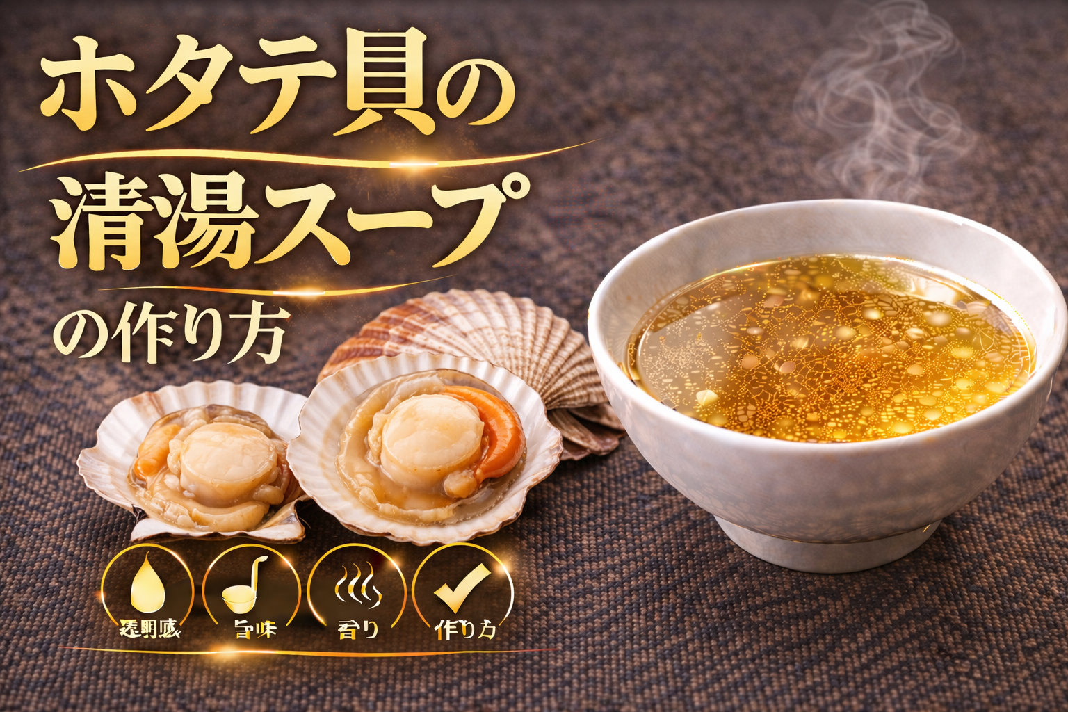 干しホタテ貝の清湯スープとは、乾燥させることで旨味成分が凝縮されたホタテを水戻しし、そのエキスを透明感を保ったまま抽出することで成立するスープである。論点は「なぜ干しホタテが独自の深みを生むのか」にあり、その背景には核酸系旨味とアミノ酸のバランスがある。干しホタテにはグルタミン酸に加えてコハク酸などの旨味成分が豊富に含まれており、これが他の魚介とは異なる甘みとコクを生み出す要因となる。さらに乾燥工程によって旨味が濃縮されるだけでなく、組織が変化することで水戻し時に効率よく成分が抽出されるという特性を持つ。分解すると、まず低温でじっくりと戻すことで内部まで水分を行き渡らせ、その後中温帯で加熱することで雑味を抑えながら旨味を引き出す工程が重要となる。高温で急激に加熱すると風味が飛びやすく、清湯としての繊細さが損なわれるため、温度制御が品質を左右する要因となる。整理すると、このスープは①乾燥による旨味の凝縮、②コハク酸を含む複合的な旨味構造、③低温戻しと中温抽出の工程設計という三つの要素で成立している。ここからの示唆は、干しホタテ貝の清湯スープは単なる魚介出汁ではなく、甘みとコクを両立した設計型スープであり、素材の前処理と抽出精度がそのまま味の完成度に直結するという点にある。