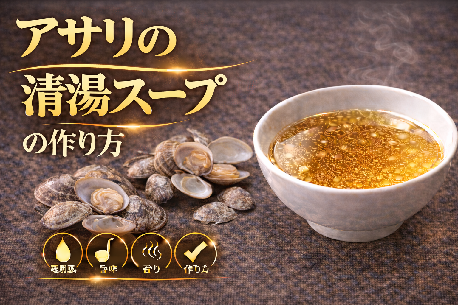 アサリの清湯スープとは、アサリに含まれるコハク酸を中心とした旨味成分を、透明感を保ちながら抽出することで成立する貝系スープであり、論点は「なぜアサリはシンプルでも強い旨味を形成できるのか」にある。その背景には、貝類特有の旨味構造があり、アサリはグルタミン酸に加えてコハク酸を豊富に含むため、単体でも立体的な味わいを構築できる特性を持つ。特にコハク酸は旨味に加えて軽い苦味や余韻を伴うため、これが味の奥行きや持続性を生む要因となる。分解すると、まず砂抜きによって不純物を除去し、雑味の発生要因を排除する工程が前提となる。その後、加熱によって貝が開くタイミングで旨味成分が一気に放出されるため、この瞬間を起点に過度な加熱を避けることが重要となる。長時間の加熱は身の収縮とともに風味の劣化や濁りの原因となるため、短時間で抽出を完了させる設計が求められる。さらに、アサリは水質の影響を受けやすく、塩分濃度や水のミネラルバランスによって味の出方が変化するため、環境条件の管理も品質に直結する。整理すると、このスープは①コハク酸を中心とした独自の旨味構造、②砂抜きによる前処理の重要性、③短時間抽出による非乳化設計という三つの要素で成立している。ここから得られる示唆は、アサリの清湯スープは単なる貝出汁ではなく、旨味の放出タイミングを捉える精密な工程設計が求められるスープであり、加熱の強度と時間の制御がそのまま味の完成度と透明感に直結するという点にある。
