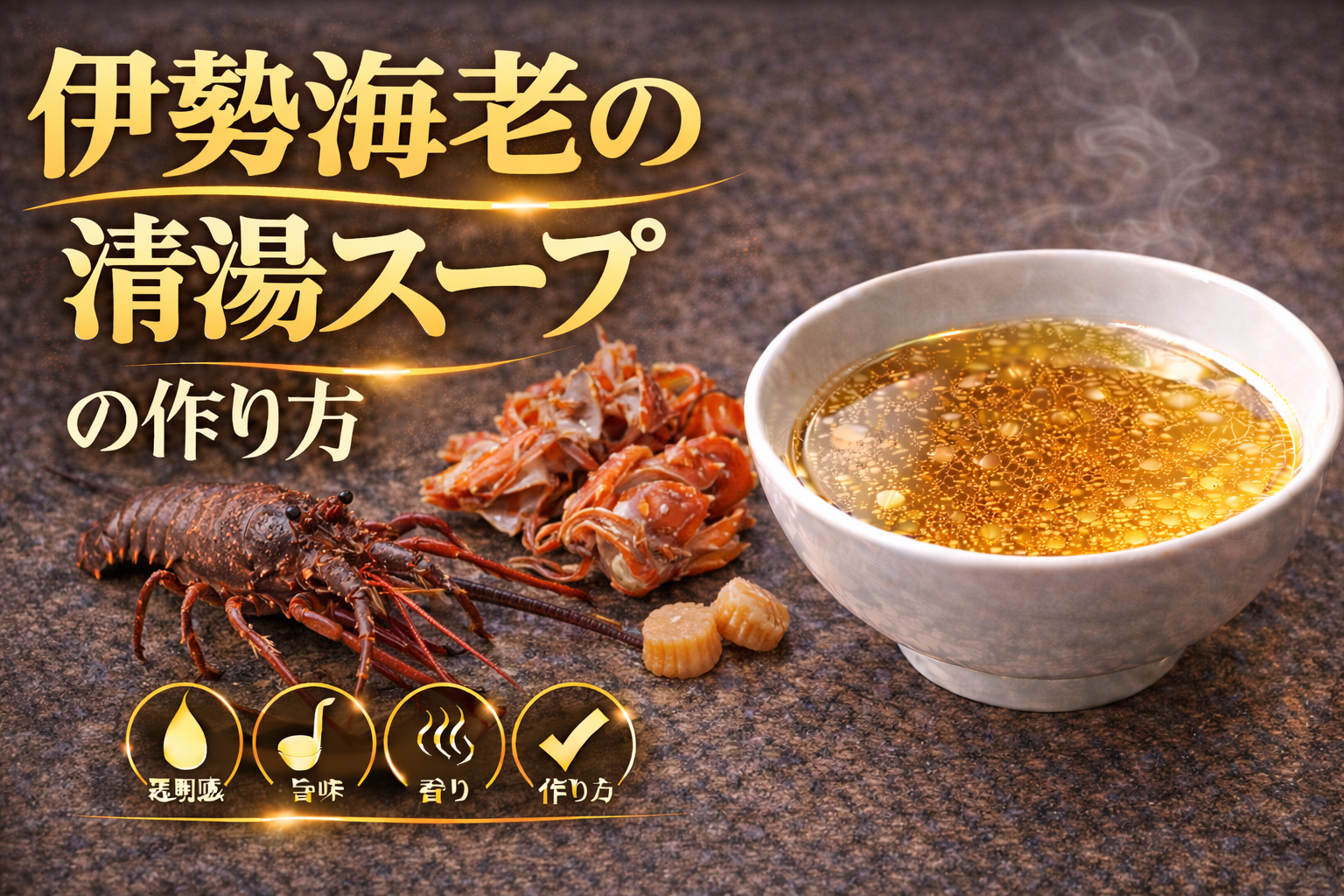 伊勢海老の清湯スープとは、伊勢海老に含まれる旨味成分と香りを透明感を保ったまま抽出し、素材の高級感と風味の立体性を最大化することで成立する魚介系スープであり、論点は「なぜ伊勢海老は清湯でも強い存在感を持つのか」にある。その背景には、甲殻類特有のアミノ酸と核酸系旨味、さらに殻に含まれる香気成分の複合的な作用がある。伊勢海老はグルタミン酸やアルギニンなどの旨味成分に加え、加熱時に殻から放出される香ばしい香りが特徴であり、これが味の厚みと余韻を形成する要因となる。分解すると、まず下処理として殻や身を適切に分け、軽く焼くことで香りを引き出し、その後に中温帯で丁寧に抽出することで、雑味を抑えつつ旨味と香りをスープへ移行させる工程が重要となる。ただし高温で強く煮出すとタンパク質の流出や乳化が進み、濁りやえぐみが発生するため、清湯としての透明性を維持するには火加減の制御が不可欠となる。整理すると、このスープは①甲殻類特有の旨味と香りの複合構造、②焼き工程による香気の強化、③非乳化を維持するための温度管理という三つの要素で成立している。ここから得られる示唆は、伊勢海老の清湯スープは単なる高級素材の使用に留まらず、香りと旨味を精密にコントロールすることで価値を最大化する設計型スープであり、素材のポテンシャルを引き出す工程精度がそのまま完成度と差別化に直結するという点にある。
