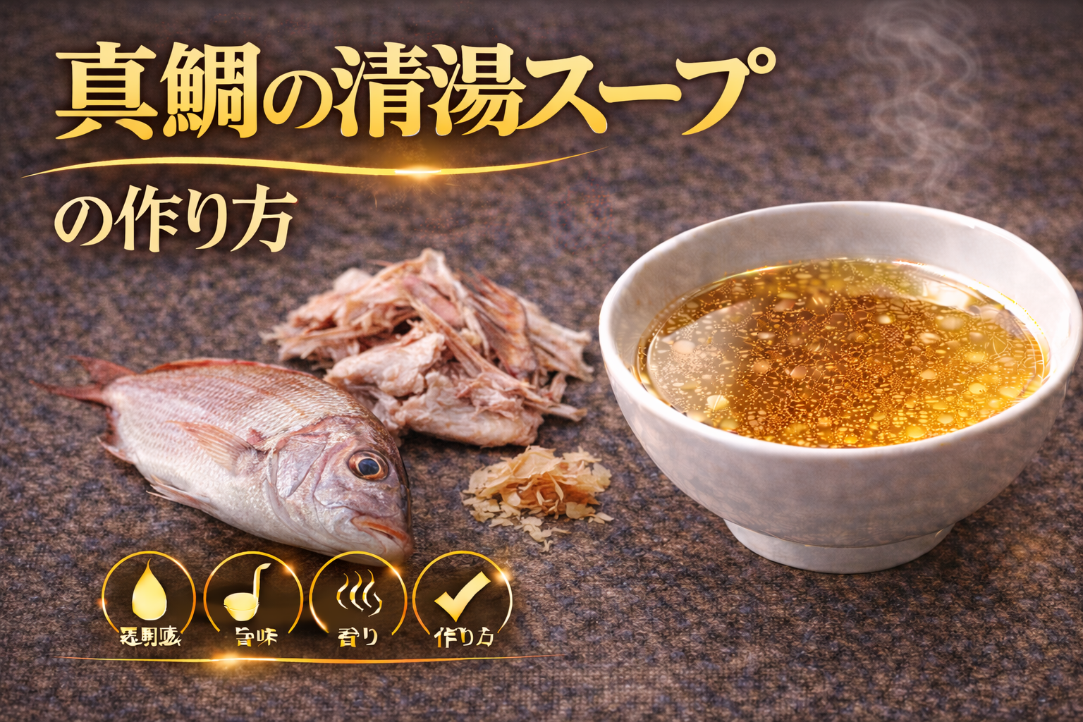 真鯛の清湯スープとは、真鯛に含まれる上品な旨味と香りを透明感を保ったまま抽出し、素材の持つ繊細さと奥行きを両立させることで成立する魚介系スープであり、論点は「なぜ真鯛は清湯として高い完成度を持つのか」にある。その背景には、真鯛が持つグルタミン酸やイノシン酸に加え、脂の質が軽く雑味になりにくいという特性が関係している。これにより、強いコクを出しすぎることなく、透明感と旨味のバランスが取りやすい素材となっている。分解すると、まず血合いや内臓など臭みの原因となる部分を丁寧に除去し、軽く霜降り処理を行うことで不純物を取り除く工程が重要となる。その後、弱火から中火で静かに加熱し、アクを取りながら旨味を抽出することで、濁りを抑えたクリアなスープが形成される。また、真鯛は加熱によって香りが立ちやすいため、必要に応じて軽く焼き工程を加えることで香ばしさを付与し、味に立体感を持たせることも可能である。整理すると、このスープは①上品でバランスの取れた旨味構造、②臭みを防ぐための丁寧な前処理、③非乳化を維持する穏やかな抽出工程という三つの要素で成立している。ここから得られる示唆は、真鯛の清湯スープは単なる魚出汁ではなく、素材の持つ繊細さを最大限に活かす設計型スープであり、工程の精度と素材の状態がそのまま味の完成度と再現性に直結するという点にある。