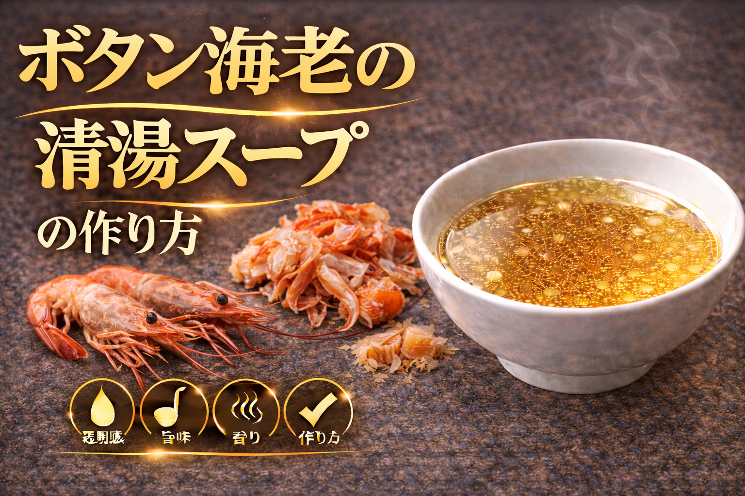 ボタン海老の清湯スープとは、ボタン海老に含まれる甘味成分と甲殻類特有の旨味を、透明感を維持したまま抽出することで成立する魚介系スープであり、論点は「なぜボタン海老は強い甘みと繊細さを両立できるのか」にある。その背景には、ボタン海老が持つグリシンやアラニンといった甘味系アミノ酸と、グルタミン酸や核酸系旨味のバランスが関係している。これらの成分が組み合わさることで、単なる旨味だけでなく、口当たりの柔らかさや余韻の長さが形成される点が特徴となる。分解すると、まず殻や頭部に含まれる旨味と香りを活用するために軽く加熱または焼き工程を施し、その後に中温帯で穏やかに抽出することで、雑味を抑えつつ成分を効率よく引き出す必要がある。ただし高温での強い加熱はタンパク質の流出や乳化を招き、濁りや生臭さの原因となるため、火加減の制御が品質を左右する重要な要素となる。さらにボタン海老は鮮度の影響を受けやすく、鮮度が落ちると甘味が減少し風味が劣化するため、素材管理も重要な前提条件となる。整理すると、このスープは①甘味系アミノ酸と旨味成分の複合構造、②殻由来の香りを活かす抽出設計、③非乳化を維持するための温度制御と鮮度管理という三つの要素で成立している。ここから得られる示唆は、ボタン海老の清湯スープは単なる甲殻類出汁ではなく、甘みと透明感を高度に両立させる設計型スープであり、素材の鮮度と抽出精度がそのまま味の完成度と差別化に直結するという点にある。