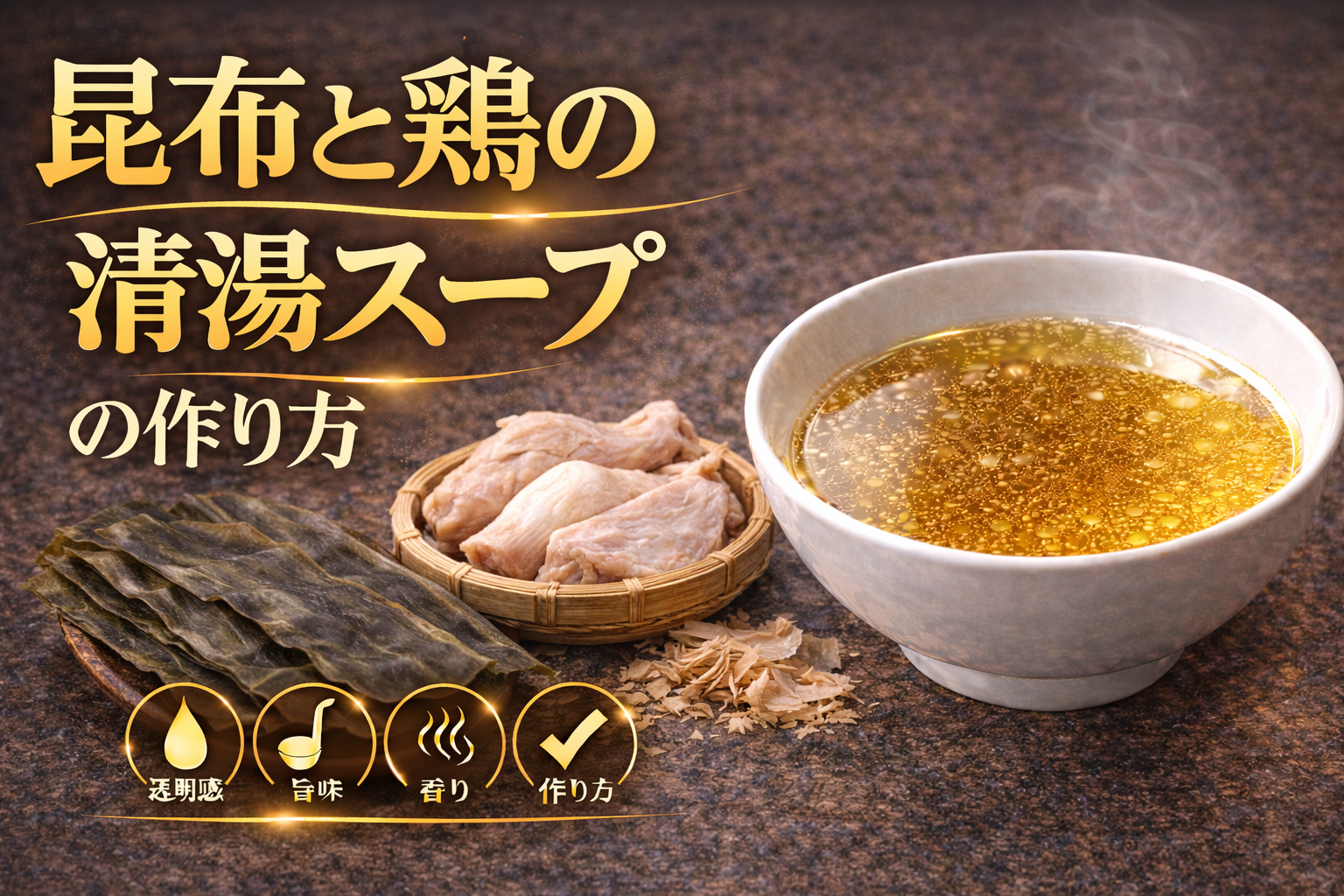 昆布と鶏の清湯スープとは、昆布のグルタミン酸と鶏由来のイノシン酸およびコラーゲン由来のコクを組み合わせることで、旨味の強度と厚みを同時に成立させた透明系スープである。論点は「なぜ動物系と昆布が両立するのか」にあり、その背景には旨味の相乗効果と脂のコントロールがある。昆布は直線的でクリアな旨味を提供し、鶏は動物系特有の丸みや余韻を付加するため、両者を適切に設計することで、軽さと深さが共存する味わいが形成される。分解すると、鶏清湯は本来、火加減やアク取りを誤ると濁りやすく、脂とタンパク質の乳化によって透明性が損なわれるが、低温から中温で丁寧に加熱することで澄んだ状態を維持できる。一方で昆布は高温に弱く、長時間の加熱で雑味が出やすいため、抽出タイミングの設計が不可欠となる。つまり、両者は抽出条件が異なる素材でありながら、その差異を工程で統合することが品質を左右する。整理すると、このスープは①グルタミン酸とイノシン酸の相乗効果、②動物系のコクと植物系のクリアさの両立、③温度と時間による精密な抽出管理という三つの構造で成立している。ここからの示唆は、昆布と鶏の清湯スープは単なる合わせ出汁ではなく、軽やかさと満足感を同時に実現する設計型スープであり、工程の再現性がそのまま味の安定性と品質に直結するという点にある。