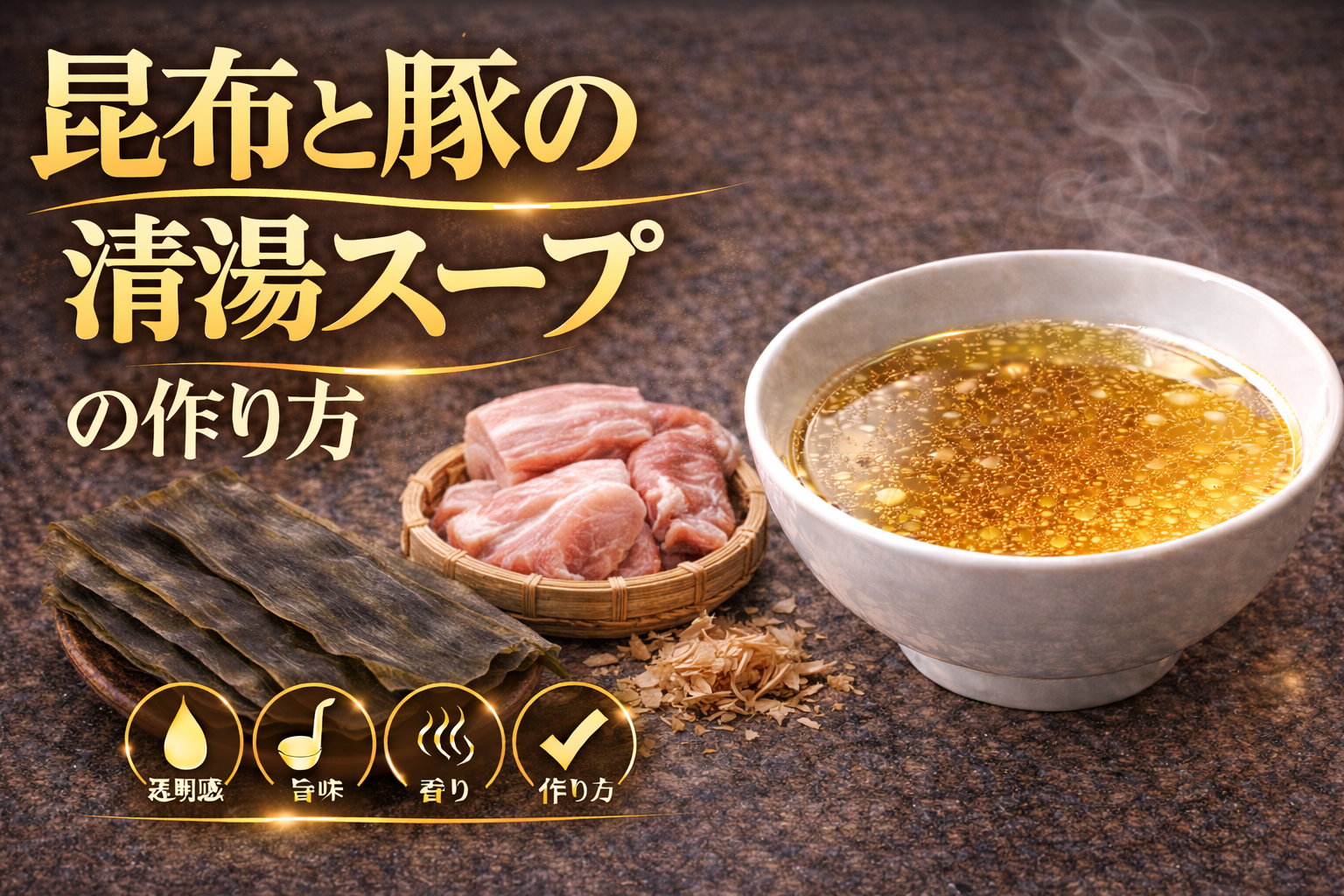 昆布と豚の清湯スープとは、昆布のグルタミン酸と豚由来のイノシン酸および脂質のコクを組み合わせることで、透明感を保ちながらも重層的な旨味と厚みを持たせたスープ設計である。論点は「なぜ豚の重さと昆布の軽さが両立するのか」にあり、その鍵は脂と抽出条件の制御にある。昆布は雑味の少ない直線的な旨味を提供する一方、豚はゼラチン質や脂質によって味に丸みと持続性を加えるが、過剰な加熱や撹拌によって乳化が進むと白濁し、清湯としての性質が崩れる。したがって、豚骨や肉は弱火から中火で静かに加熱し、アクを丁寧に取り除くことで透明性を維持する必要がある。分解すると、昆布は低温帯で先に旨味を抽出し、一定温度で取り出すことでえぐみを防ぎ、豚はその後に時間をかけて旨味を引き出すという工程分離が重要となる。この二段階構造により、昆布のクリアな基盤の上に豚のコクを重ねることが可能になる。整理すると、このスープは①グルタミン酸とイノシン酸の相乗効果、②脂質を抑えた非乳化設計、③素材ごとの抽出タイミングの最適化という三つの要素で成立している。ここから得られる示唆は、昆布と豚の清湯スープは単なる濃厚スープの軽量版ではなく、透明性と満足感を両立させる高度な設計であり、火加減や撹拌といった微細な操作が品質を大きく左右する点にある。