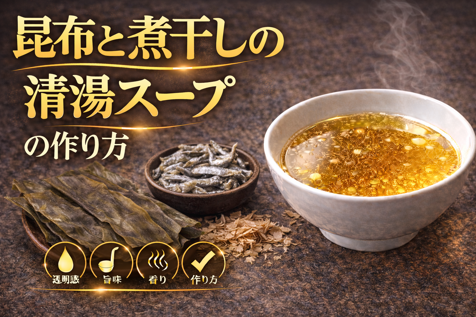 昆布と煮干しの清湯スープとは、昆布のグルタミン酸と煮干しに含まれるイノシン酸および核酸系の旨味を組み合わせることで、より複層的な旨味構造を形成する透明系スープである。論点は「なぜこの組み合わせが独特の深みを生むのか」にあり、その背景には旨味の重なり方の違いがある。昆布は直線的で穏やかな旨味を持つ一方、煮干しは魚由来の力強い旨味と香りを持ち、さらに脂質や微量成分によって味に厚みが加わる。この差異が補完関係を生み、単体では得られない立体的な味わいを構築する。分解して考えると、昆布は低温帯で時間をかけて抽出することで雑味を抑えつつ旨味を引き出し、煮干しは頭や内臓の処理によって苦味やえぐみをコントロールしたうえで、中温から高温帯で短時間抽出する必要がある。ここで抽出条件を誤ると、煮干し特有の苦味が前面に出てしまい、清湯としての透明感やバランスが崩れるため、工程設計が品質を大きく左右する。整理すると、このスープは①穏やかな旨味と力強い旨味の対比、②前処理と温度管理による雑味制御、③透明性を維持しながら旨味を重ねる設計という三つの要素で成立している。ここから得られる示唆は、昆布と煮干しの清湯スープは単なる和風出汁の一種ではなく、旨味のコントラストを活用した設計型スープであり、素材の処理精度と抽出の再現性が味の安定性を決定づけるという点にある。