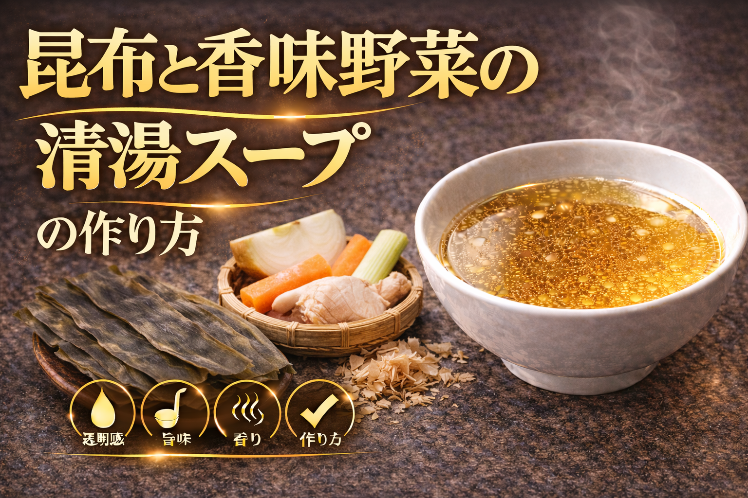 昆布と香味野菜の清湯スープとは、昆布のグルタミン酸を基軸に、玉ねぎや長ねぎ、人参、セロリなどの香味野菜が持つ糖質や揮発性成分を組み合わせることで、透明感を保ちながら複雑な風味を構築するスープである。論点は「なぜ動物系を使わずに奥行きが出るのか」にあり、その背景には旨味と香りの役割分担がある。昆布は主に味の骨格となる直線的な旨味を形成し、一方で香味野菜は加熱によって甘味や香りを引き出し、味の広がりや余韻を補完する。この構造により、脂質に依存せずとも満足感のあるスープが成立する。分解すると、昆布は低温で穏やかに抽出し、雑味を抑えることが前提となる一方、香味野菜は中温から高温で加熱することで細胞壁が崩れ、糖や香気成分がスープに溶け出すため、投入タイミングと加熱時間が重要となる。また、過度な加熱は野菜特有のえぐみや濁りを生むため、火加減の調整が透明性維持の鍵となる。整理すると、このスープは①旨味(昆布)と香り・甘味(野菜)の機能分離、②温度帯の異なる素材の統合、③非乳化かつ低脂質によるクリアな設計という三つの要素で成立している。ここからの示唆は、昆布と香味野菜の清湯スープは軽やかでありながら設計自由度が高く、動物系素材を用いない場合でも十分な深みを実現できるスープであり、素材ごとの抽出特性を理解することが味の再現性を高める要因となる。