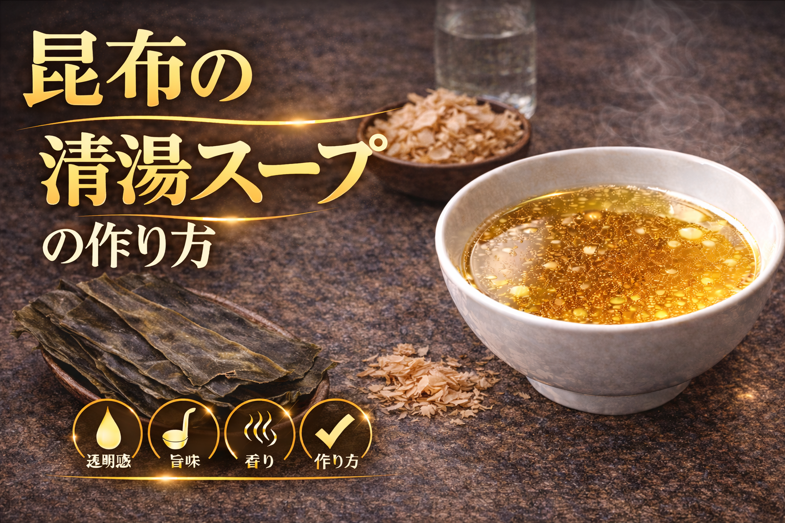 昆布の清湯スープとは、昆布に含まれるグルタミン酸を中心とした旨味成分を、透明感を保ったまま抽出することで成立するスープ設計である。論点は「なぜ昆布だけで成立するのか」にあり、その背景には旨味の単一性と純度の高さがある。昆布は動物系素材と異なり、脂質やコラーゲンをほとんど含まないため、加熱しても乳化や濁りが起こりにくく、結果として視覚的にも味覚的にもクリアなスープが形成される。この特性により、素材の輪郭が明確に立ち上がる点が最大の特徴といえる。さらに分解すると、昆布の旨味は温度依存性が高く、60℃前後で最も効率よく抽出される一方、過度な加熱はアルギン酸由来のぬめりや雑味を引き出すため、温度管理が品質を左右する要因となる。つまり、昆布清湯は単なる「出汁」ではなく、抽出条件そのものが味の設計に直結する構造を持っている。整理すると、昆布清湯スープは①低脂質による非乳化構造、②グルタミン酸主体の直線的な旨味、③温度制御による品質変動という三つの要素で成立している。ここから得られる示唆は、他素材との掛け合わせにおいても、昆布はベースとしての安定性が高く、味の設計軸を担う存在であるという点である。したがって昆布清湯は、単体で完成するだけでなく、複合スープの基盤としても機能する汎用性の高いスープと位置付けられる。