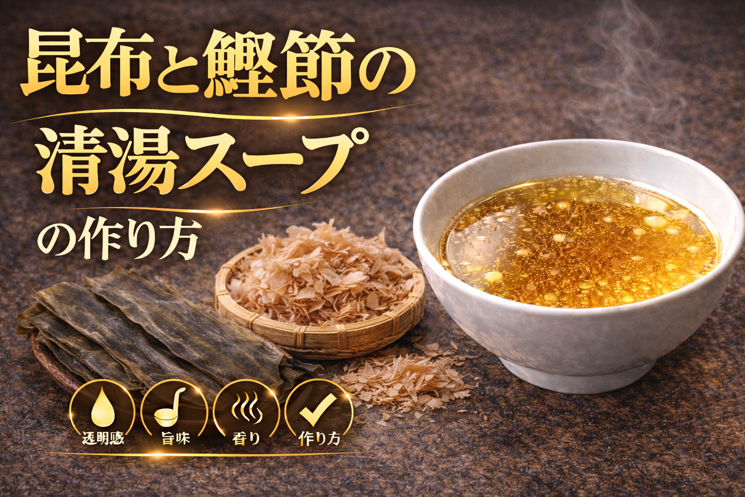 昆布と鰹節の清湯スープとは、昆布のグルタミン酸と鰹節のイノシン酸という異なる旨味成分を組み合わせることで、相乗効果によって旨味の強度と奥行きを高めた透明系スープである。論点は「なぜこの組み合わせが成立するのか」にあり、その本質は単なる足し算ではなく、旨味の増幅構造にある。グルタミン酸とイノシン酸は同時に存在することで旨味が数倍に感じられる特性を持ち、これにより少ない素材量でも満足度の高い味わいを形成できる。このため、過剰な抽出や複雑な素材構成に頼らずとも、輪郭のはっきりしたスープが成立する点が特徴となる。さらに分解すると、昆布は低温帯でじっくり旨味を引き出し、鰹節は高温で短時間抽出するという異なる抽出条件を必要とするため、工程設計が味の完成度を左右する重要な要素となる。具体的には、昆布を60℃前後で抽出した後に取り出し、沸騰直前の温度帯で鰹節を加えて短時間で濾すことで、雑味やえぐみを抑えながら両者の旨味を最大化できる。整理すると、このスープは①旨味の相乗効果、②異なる抽出温度の統合、③透明性を維持する工程管理という三つの構造で成立している。ここからの示唆として、昆布と鰹節の清湯スープは単なる和風出汁に留まらず、ラーメンや各種料理においても味の基盤を支える設計要素となり得ることが分かる。つまり、素材の特性理解と抽出の精度が、そのまま味の再現性と品質に直結するスープである。