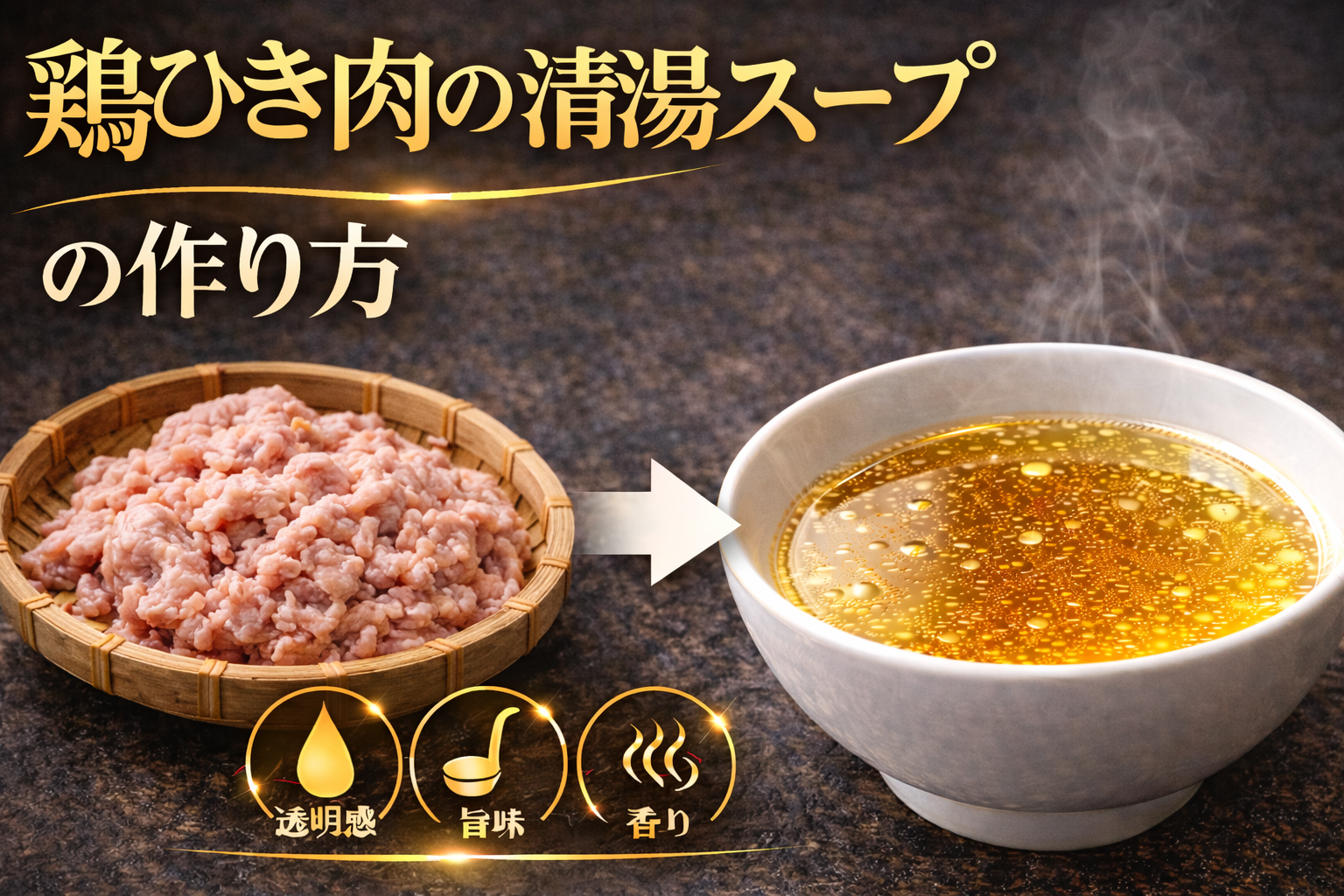 鶏ひき肉の清湯スープとは、鶏ガラではなく細かくした鶏肉を用いて旨味を抽出し、透明度を保ちながら仕上げるスープを指す。この手法を理解するには、「なぜひき肉を使うのか」という点を分解して考える必要がある。ひき肉は表面積が大きく、水に触れる面が増えるため、短時間で効率的に旨味成分を抽出できるという特徴を持つ。一方で、この構造は同時にタンパク質の流出量も増やすため、加熱条件を誤るとスープが濁りやすくなるリスクも伴う。そのため、低温域からゆっくりと加熱を始め、浮いてくるアクやタンパク質を丁寧に取り除く工程が不可欠となる。また、ひき肉は骨由来のゼラチンが少ないため、ガラ主体のスープに比べて軽やかで雑味の少ない味わいになりやすい。この特性により、タレや香味油の設計自由度が高まる点も特徴である。結果として鶏ひき肉の清湯スープは、抽出効率と制御精度のバランスによって成立する、軽快さと明瞭さを重視した清湯スープと位置付けられる。